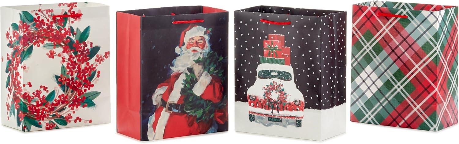 Hallmark 13″ Large Christmas Gift Bag Bundle (3 Bags: Joy Wreath on Gray, Rustic Santa with Tree, Happy Holidays on Red) for Friends, Family, Teachers, Coworkers(1 Count (Pack of 4))