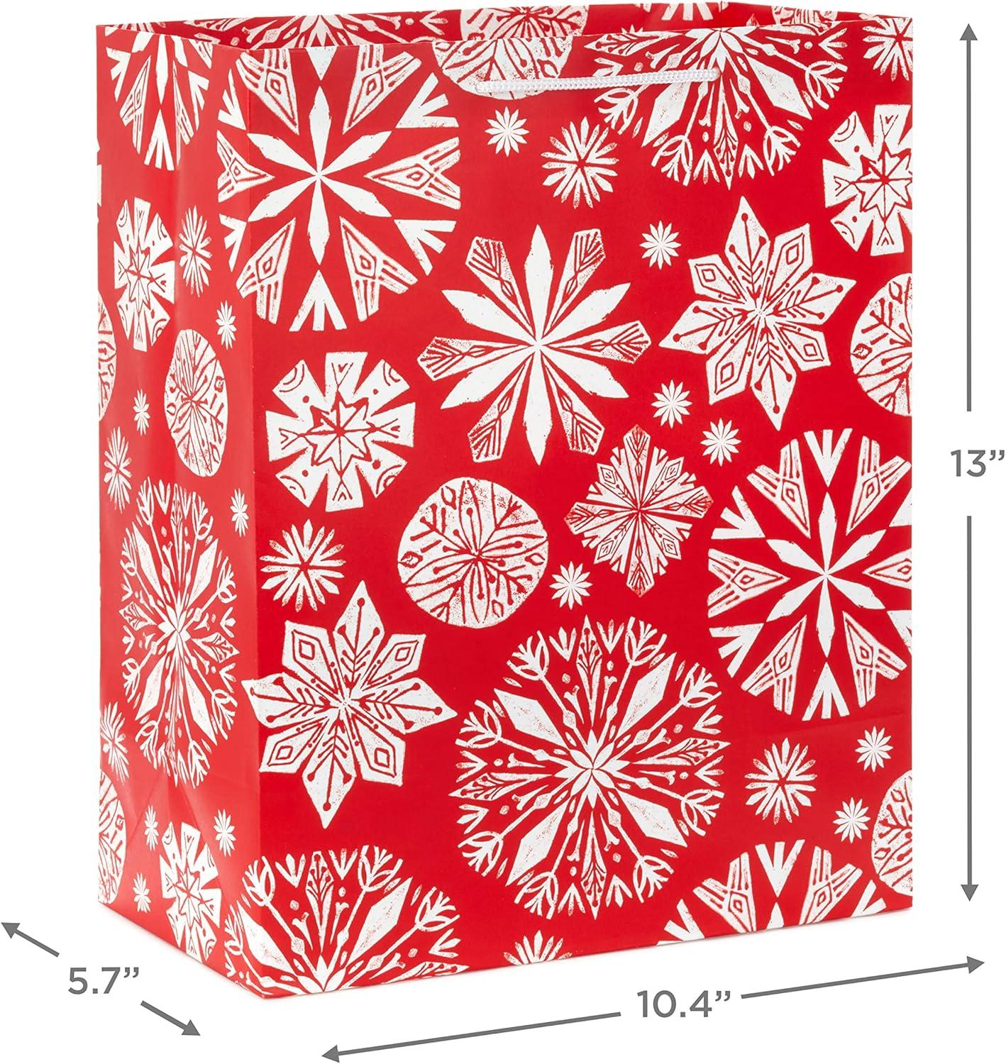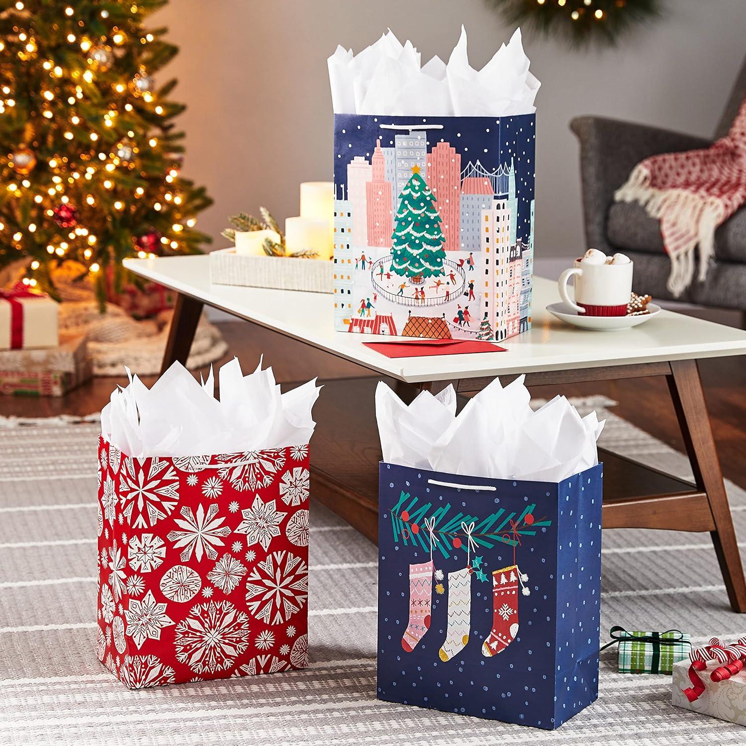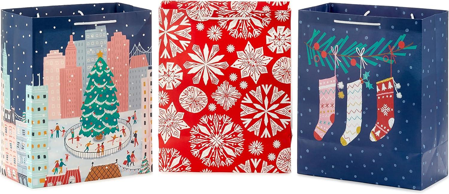 Hallmark 13″ Large Cute Christmas Gift Bags (3 Bags: Pink Stockings on Branch, Paper Snowflakes, Ice Skating in the City) for Kids, Teens, Friends, Teachers(Pink Gray Red)