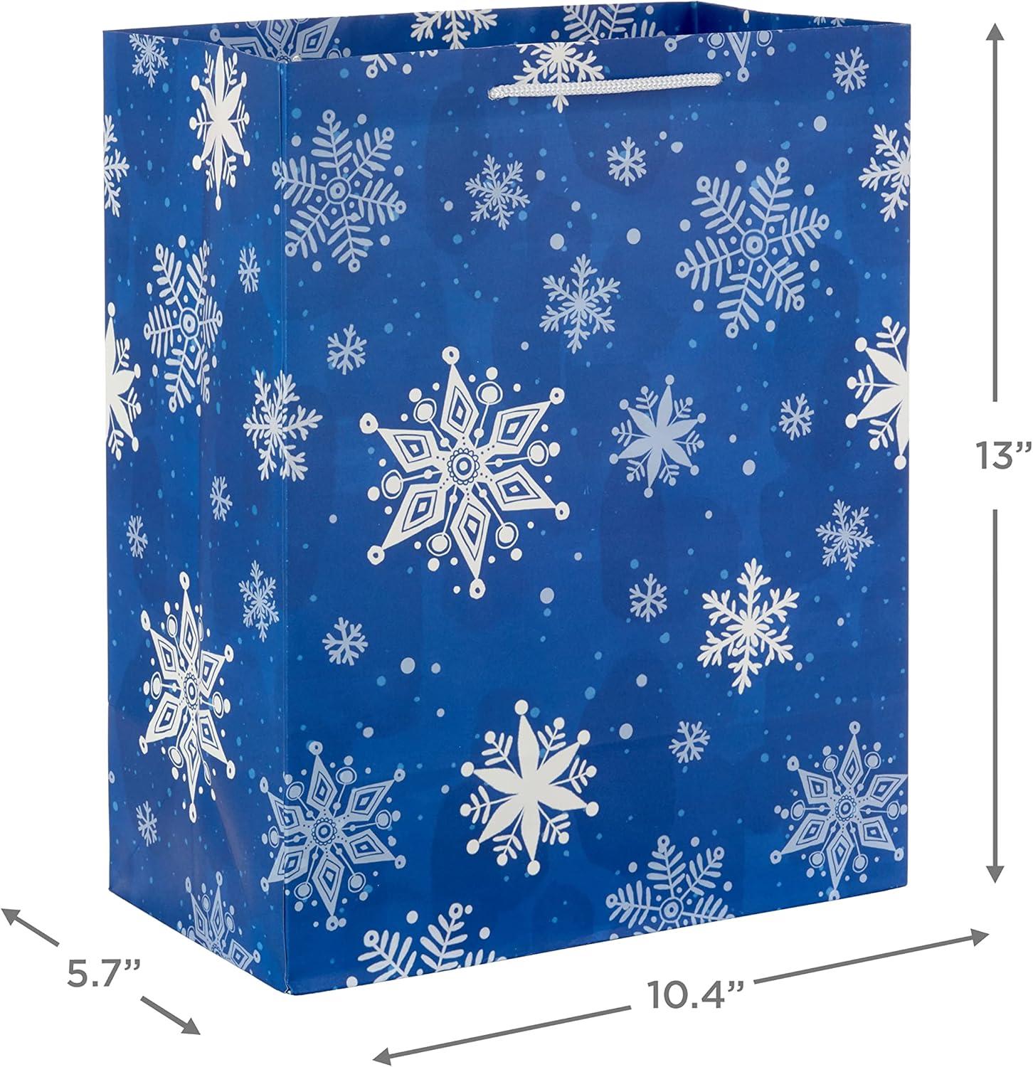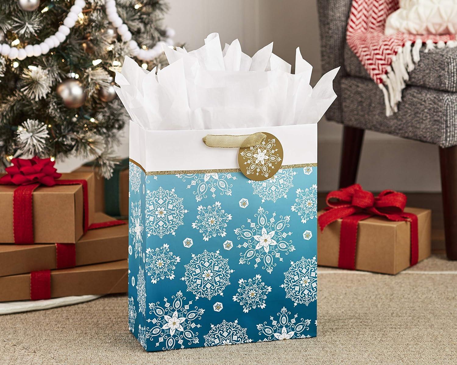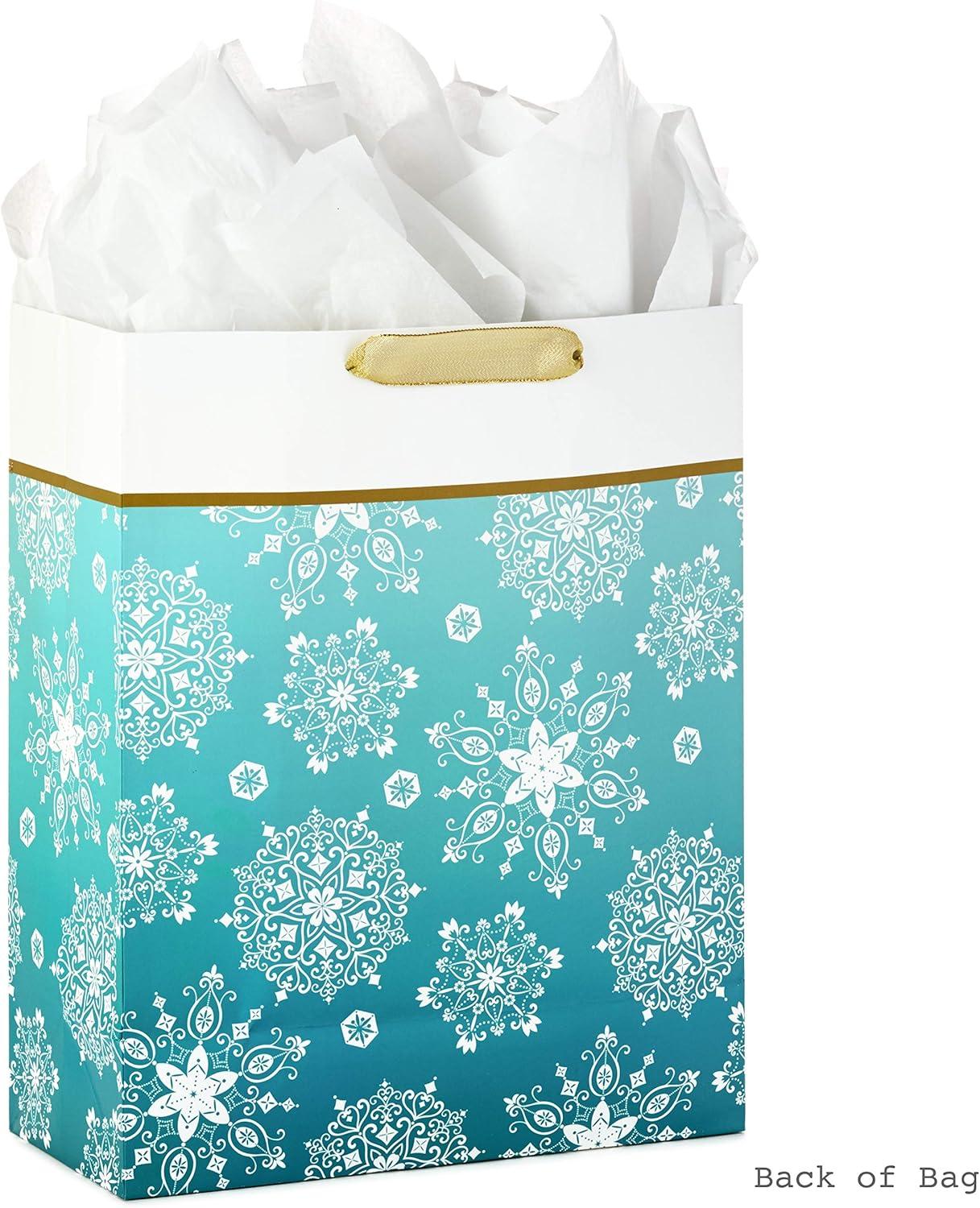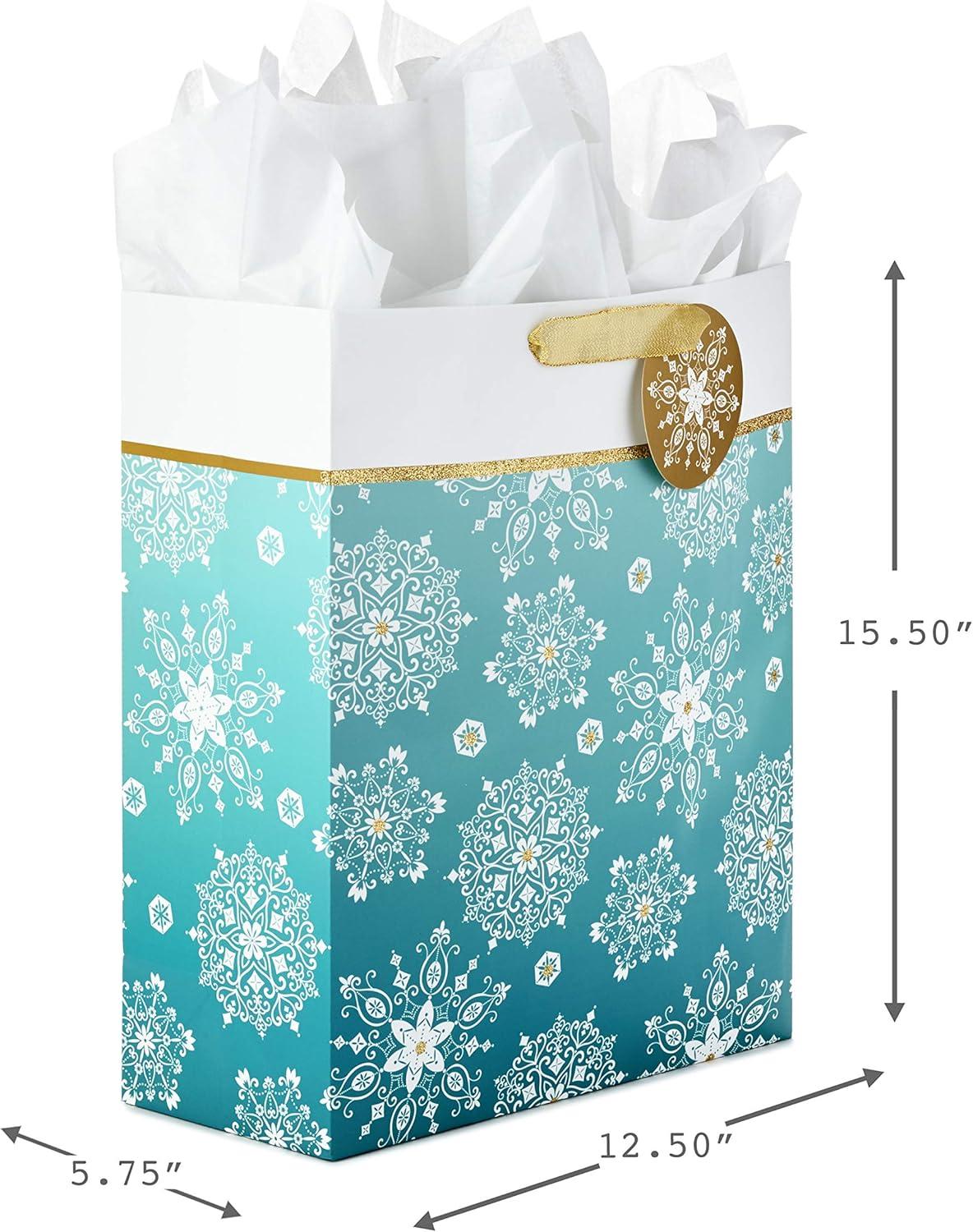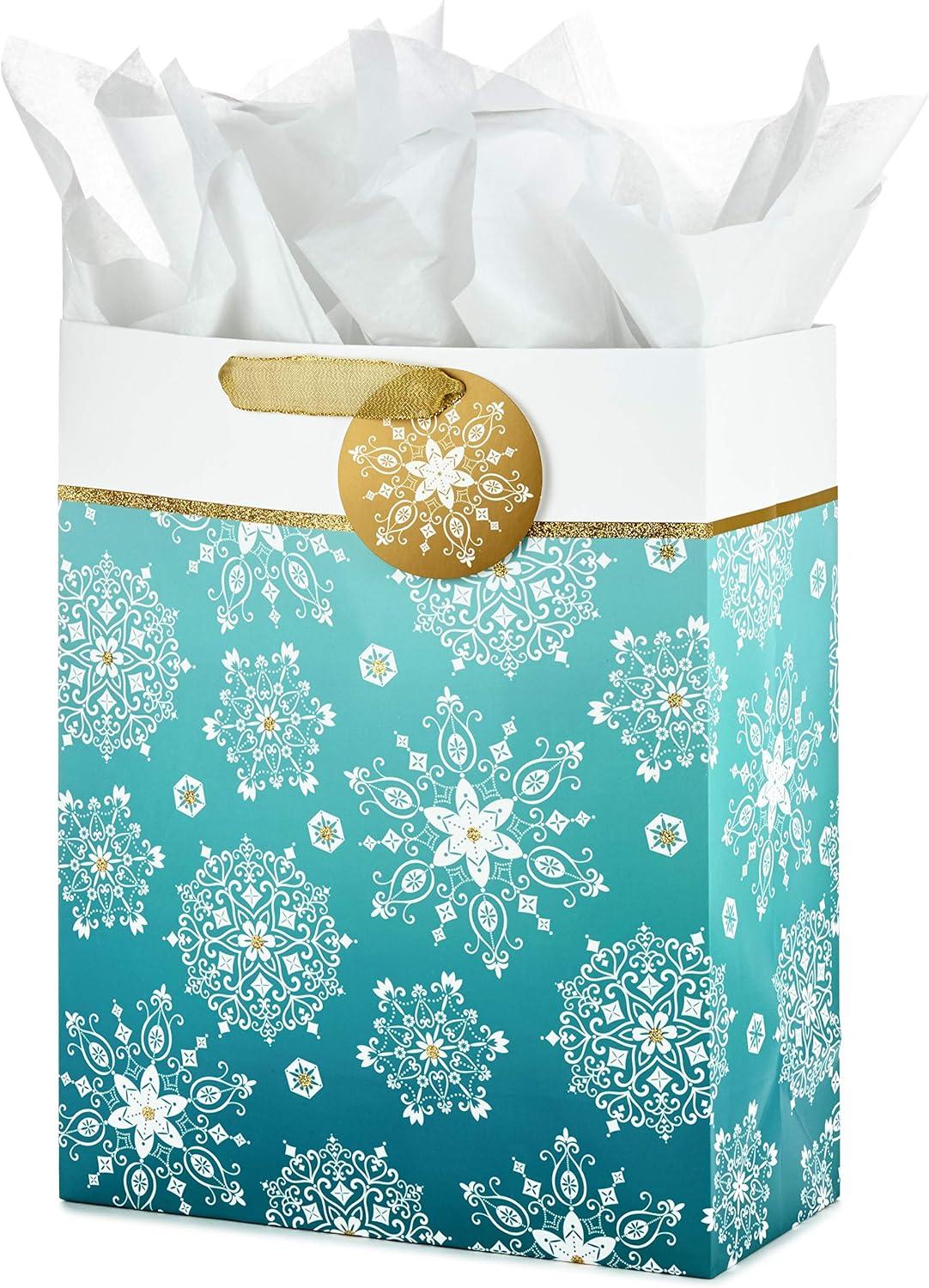 Hallmark 15″ Extra Large Holiday Gift Bag with Tissue Paper (Teal Blue and Gold, Snowflakes) for Hanukkah, Winter Solstice, Christmas(Snowflakes on Teal)