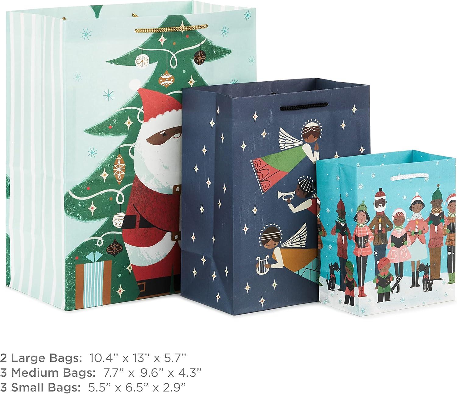 Hallmark Mahogany Christmas Gift Bag Assortment (8 Bags; 3 Small 6″, 3 Medium 9″, 2 Large 13″) Black Santa Claus, African-American Angels, Carolers