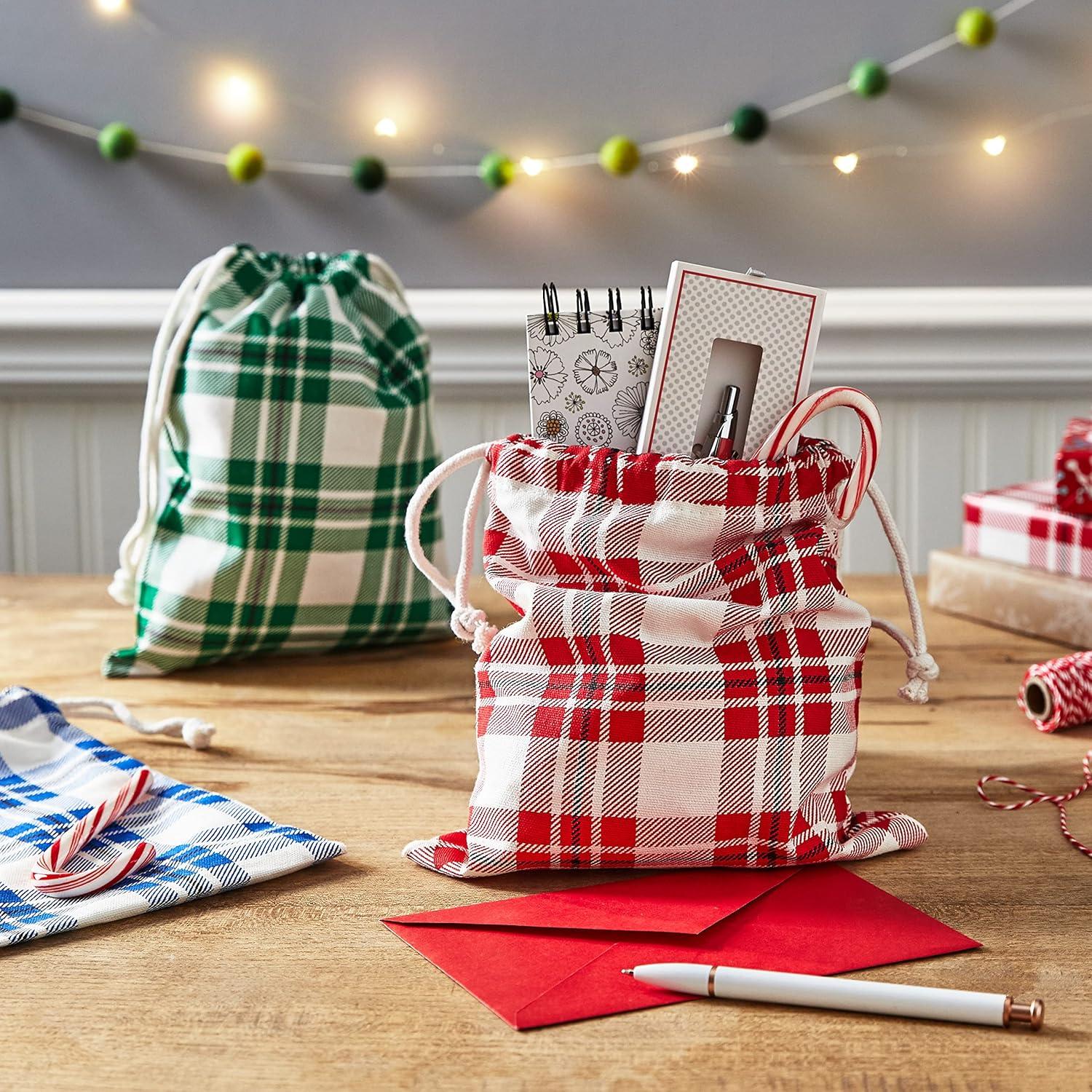 Hallmark Drawstring Christmas Gift Bag Set (2 Fabric Bags with Drawstrings; 1 Medium 10″, 1 Extra Large 20″) Santa, Red and White Stripe, 5XGB4902(Red Blue Green)