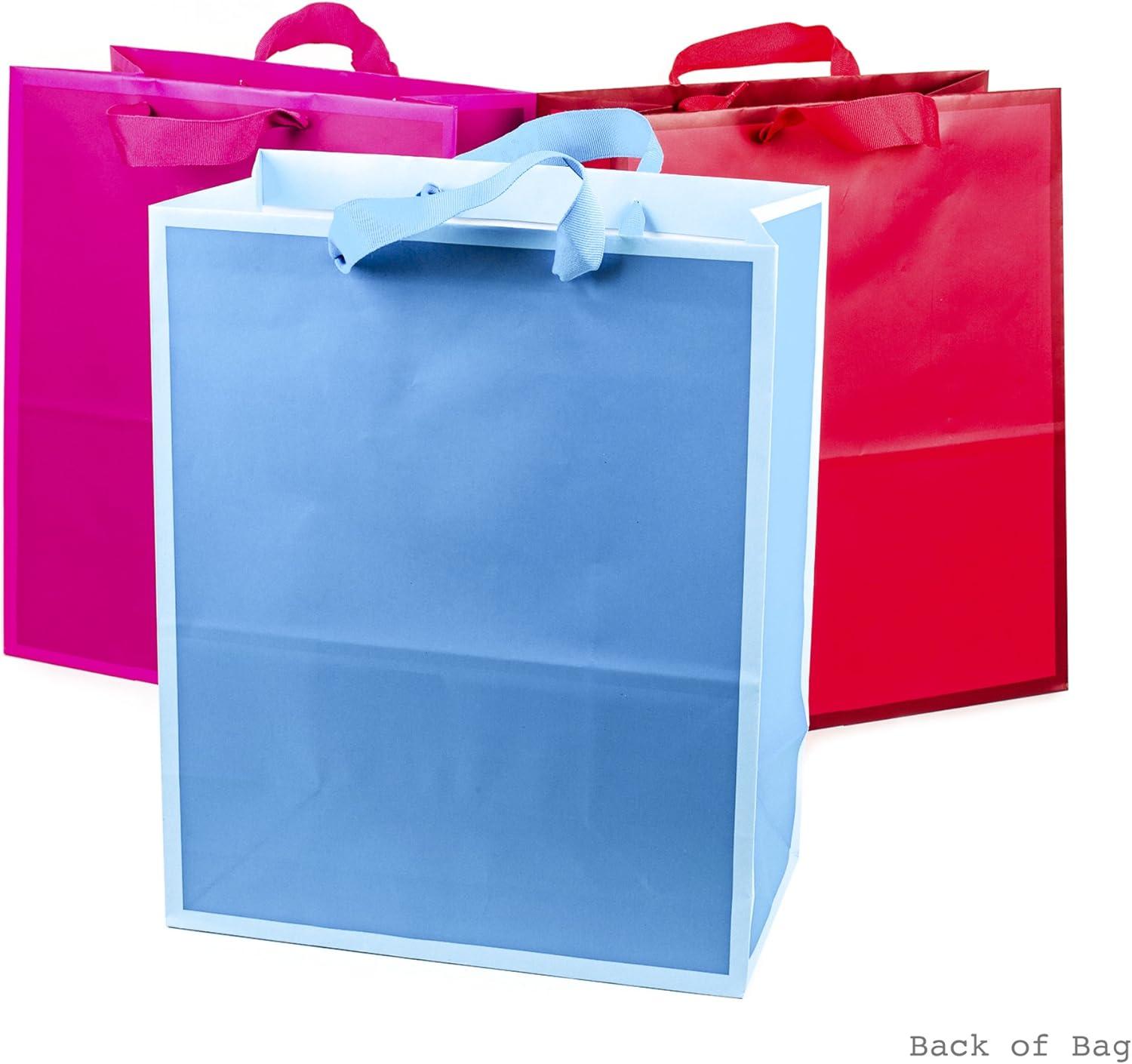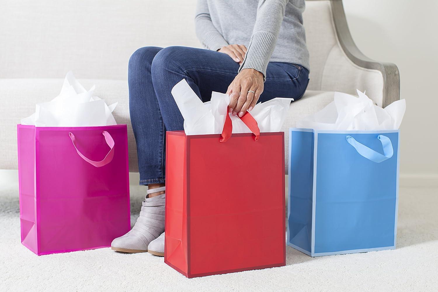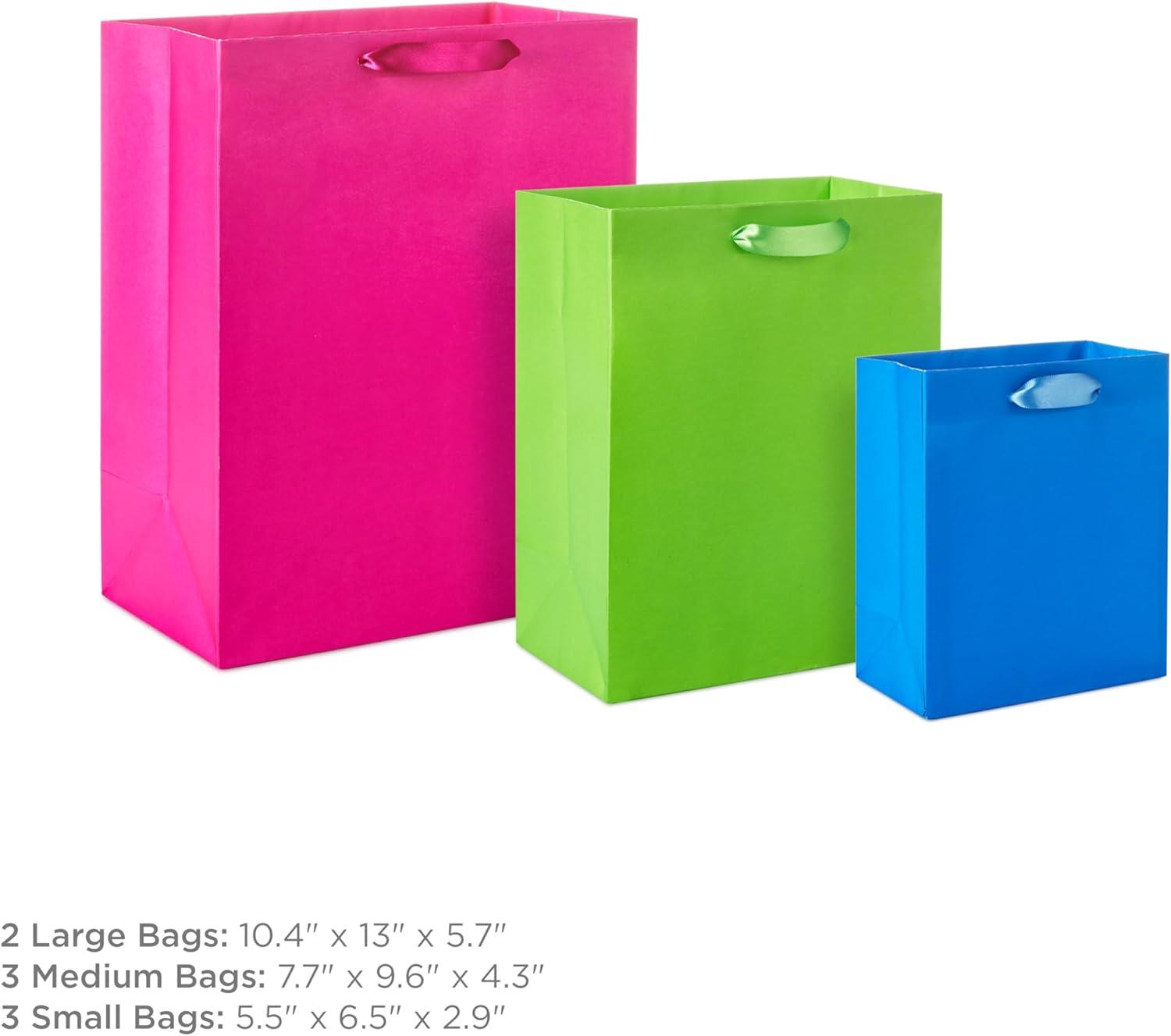 Hallmark Assorted Gift Bags (8 Bags: 3 Small 6″, 3 Medium 9″, 2 Large 13″) Solid Pink, Blue, Green, Yellow, Red(Large (Pack of 3))