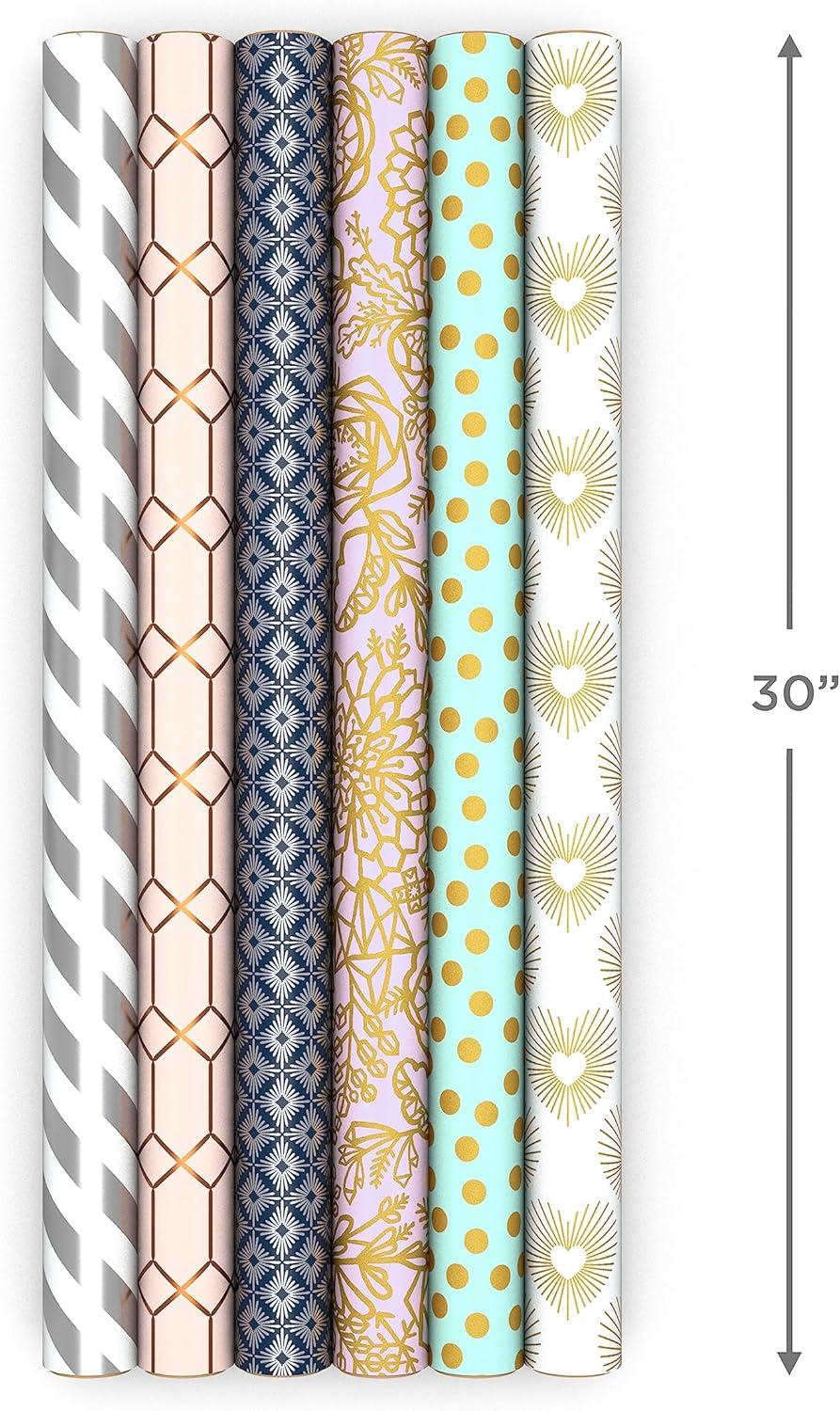 Hallmark Wrapping Paper with Cutlines on Reverse (6 Rolls: 180 Sq. Ft. Total) White and Silver Stripes, Mint Green, Gold Hearts and Flowers for Weddings, Bridal Showers, Birthdays(Silver Pink Navy Mint Gold)