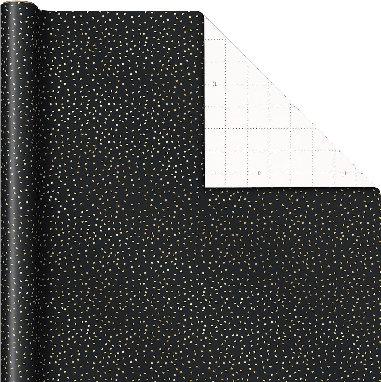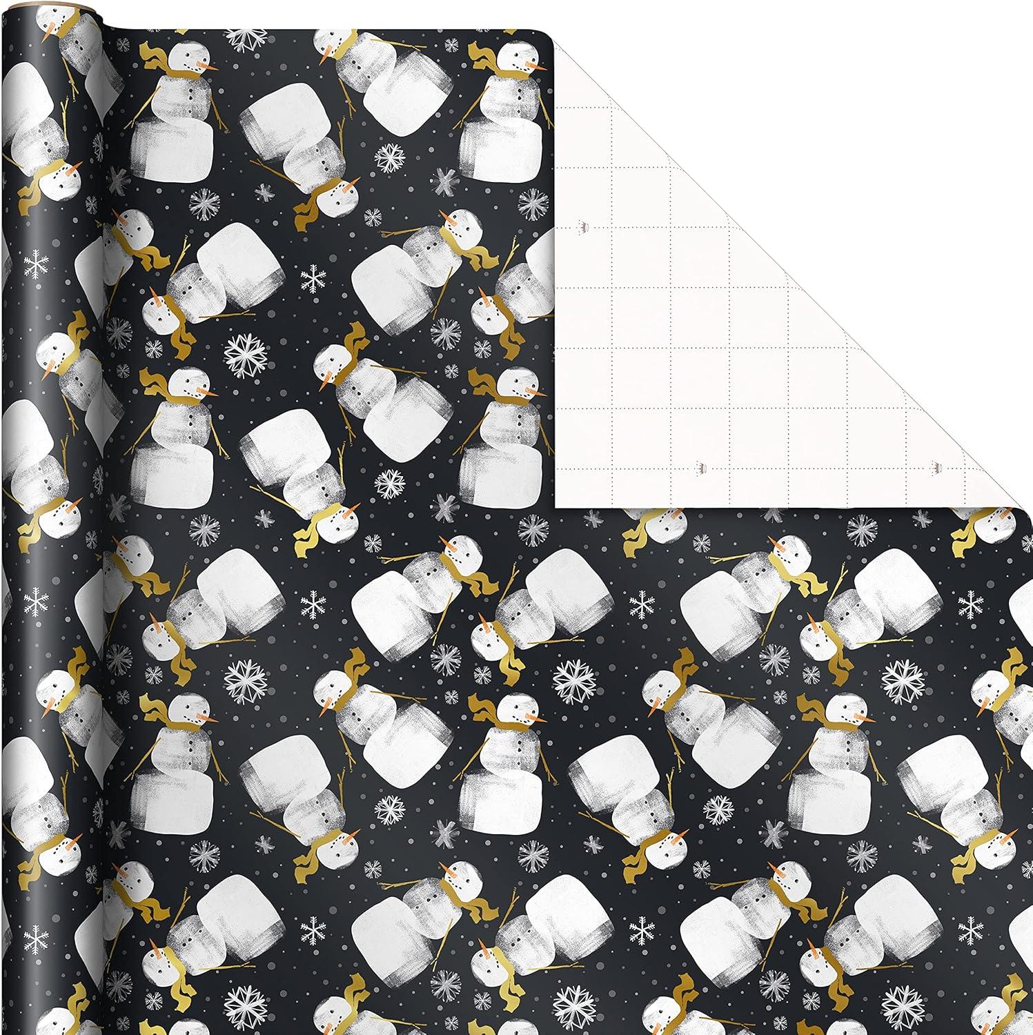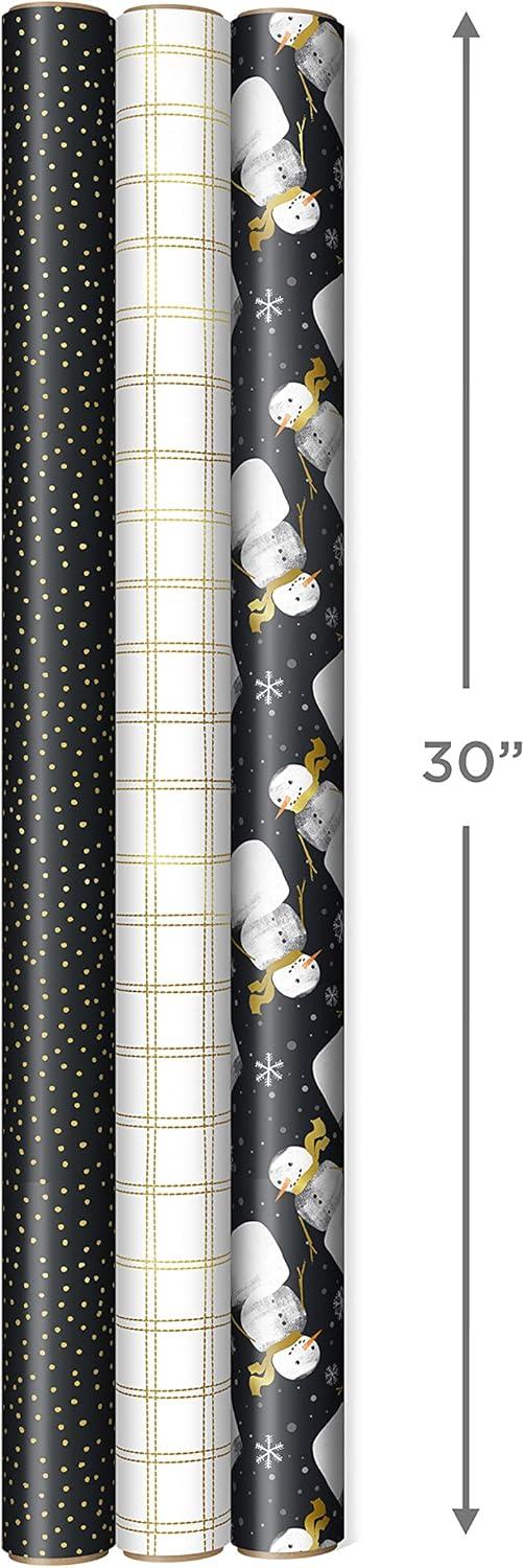 Hallmark Black Christmas Wrapping Paper with Cut Lines on Reverse (3 Rolls: 120 sq. ft. ttl) Retro Santa, Black and White Buffalo Plaid, Train and Trees (0005JXW1077)(Charcoal Black Snowmen Gold Plaid Gray Dots)