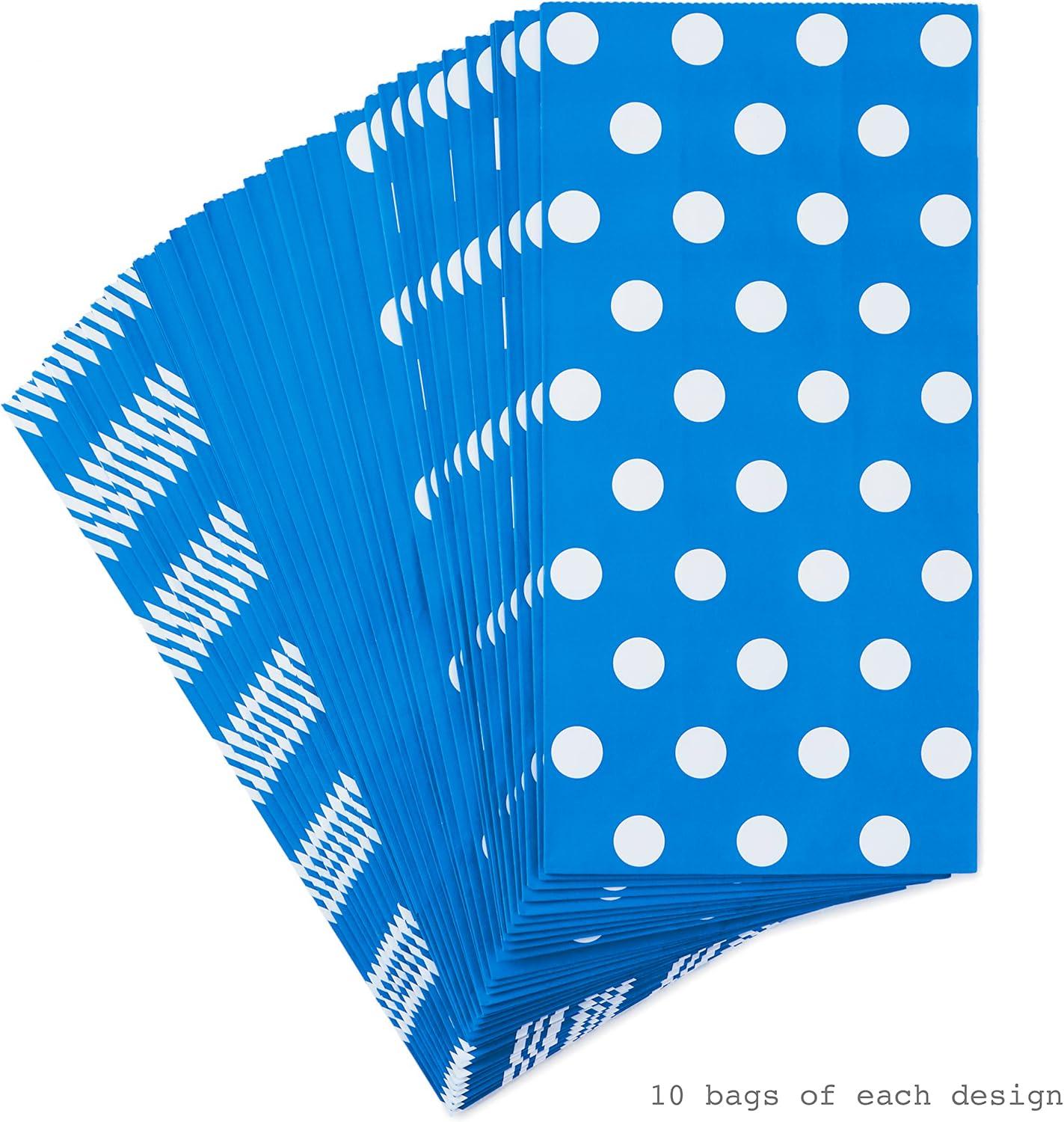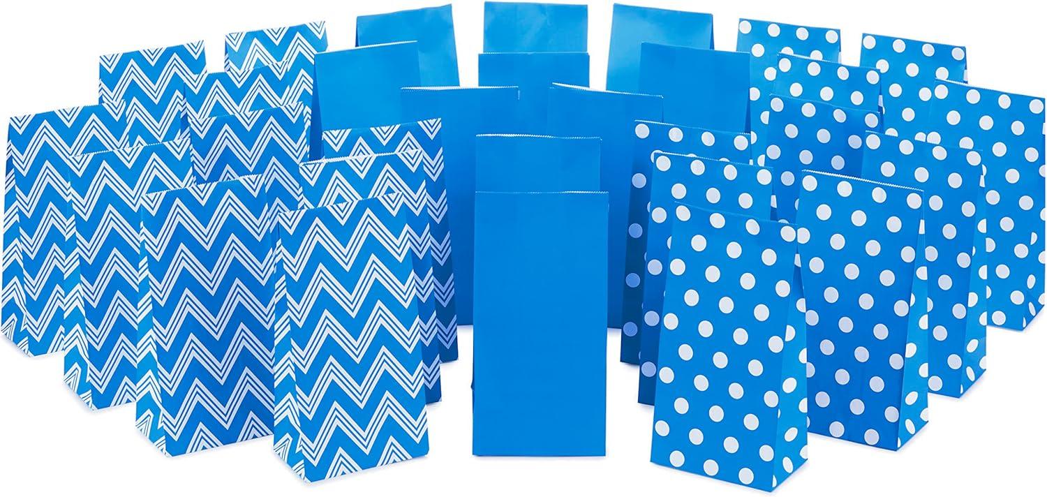 Hallmark Blue Party Favor and Wrapped Treat Bags, Assorted Designs (30 Ct., 10 Each of Chevron, White Dots, Solid) for Birthdays, Baby Showers, School Lunches, Hanukkah, Care Packages, May Day(Blue Chevron Solid Polka Dot)
