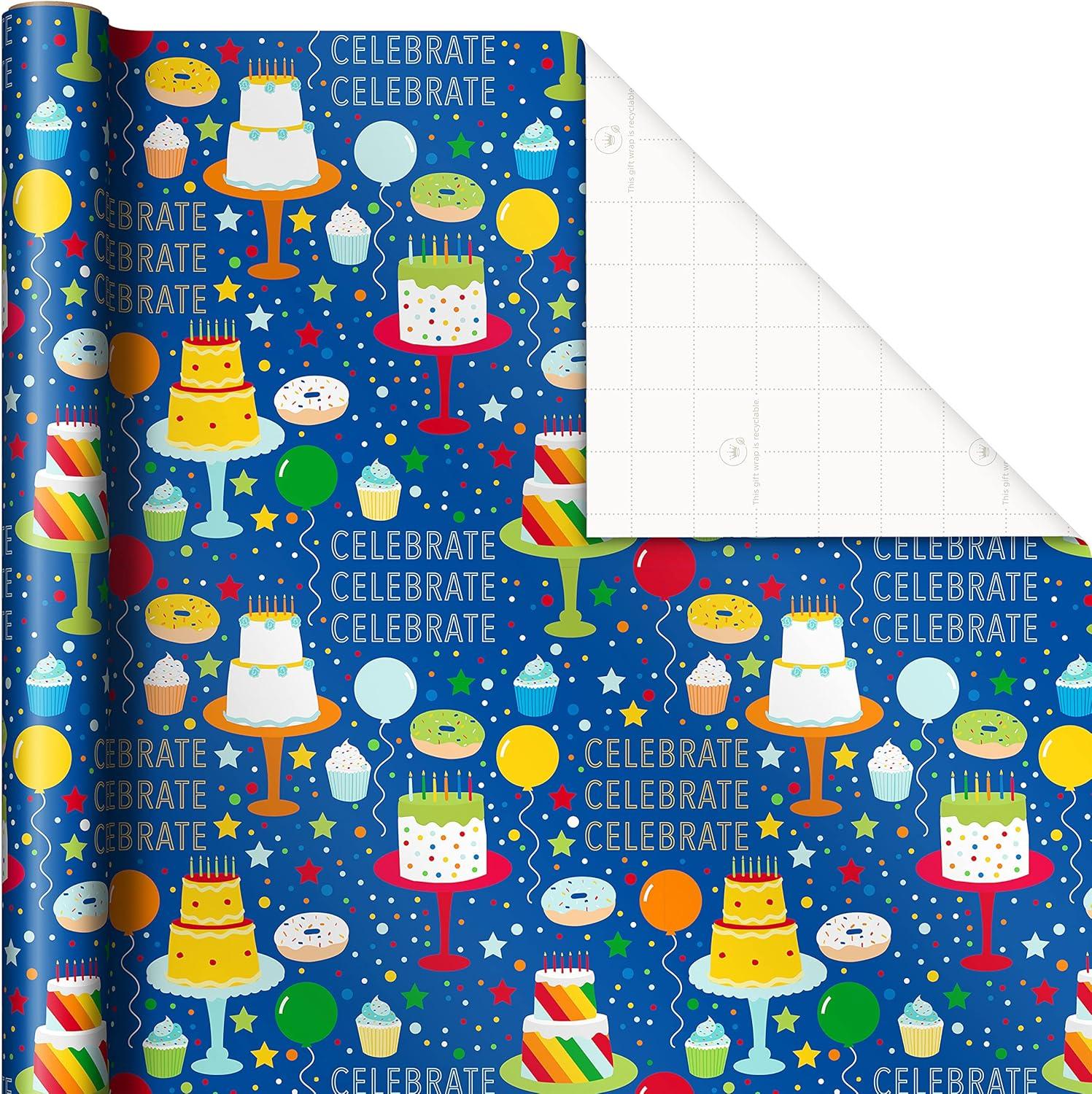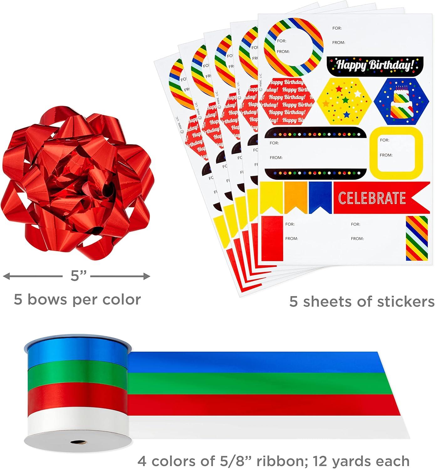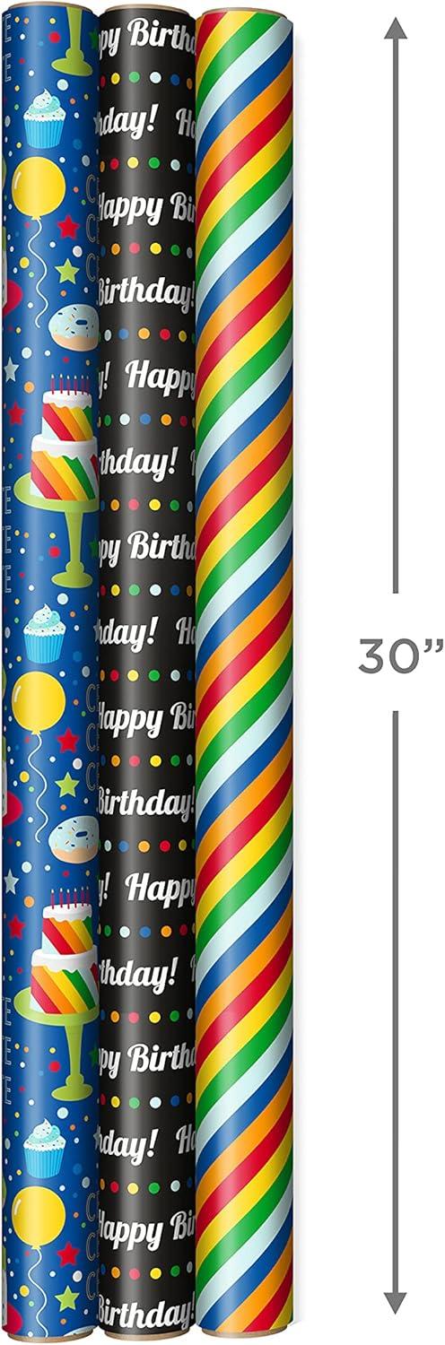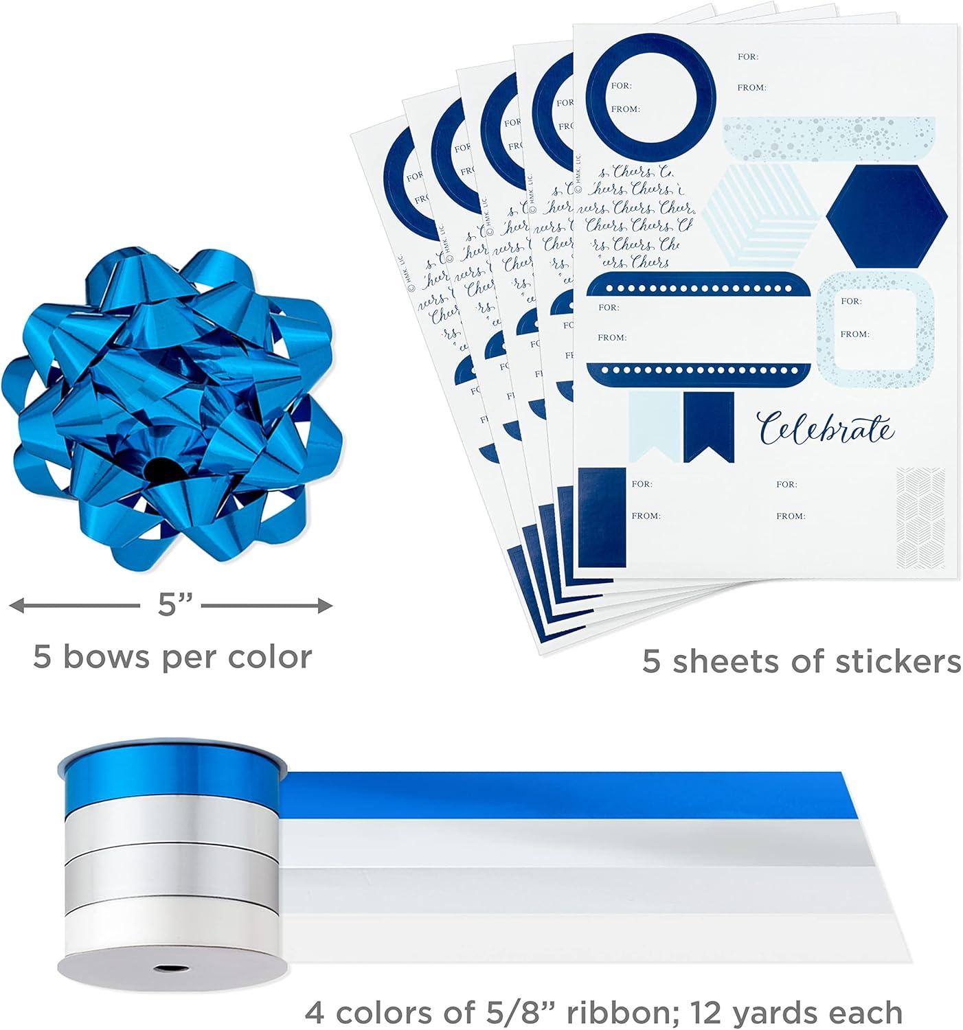 Hallmark Blue and Silver Wrapping Paper Set (3 Rolls: 90 Sq. Ft. Ttl, 10 Bows, Ribbon, Gift Tag Stickers) for Birthdays, Hanukkah, Father’s Day, Graduations, Weddings(Bright Birthday)
