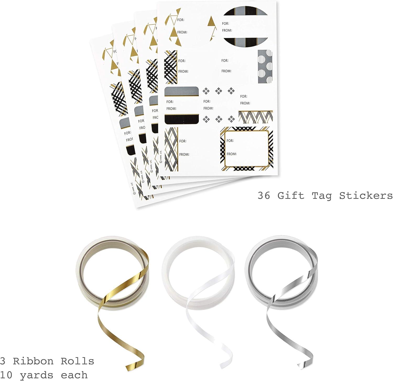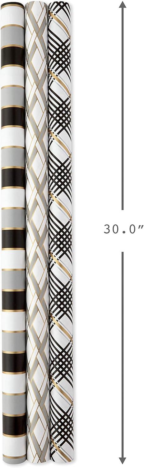 Hallmark Blue and Silver Wrapping Paper Set (3 Rolls: 90 Sq. Ft. Ttl, 10 Bows, Ribbon, Gift Tag Stickers) for Birthdays, Hanukkah, Father’s Day, Graduations, Weddings(White Black Gold Gray)