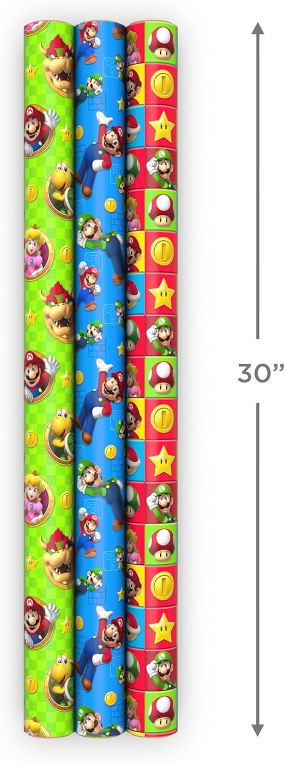Hallmark Nintendo Super Mario Wrapping Paper Rolls for Kids with Cutlines on Reverse (3 Rolls: 60 Sq. Ft. Total) Mario, Luigi, Yoshi, Bowser, Princess Peach, Toad(Nintendo)