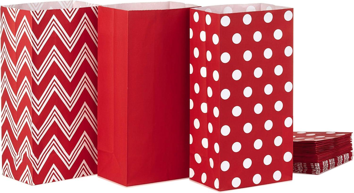 Hallmark Red Party Favor and Wrapped Treat Bags, Assorted Designs (30 Ct., 10 Each of Chevron, White Dots, Solid) for Christmas, Valentines Day, Sweetest Day, May Day, Mothers Day, Care Packages(Red Chevron Solid Polka Dot)