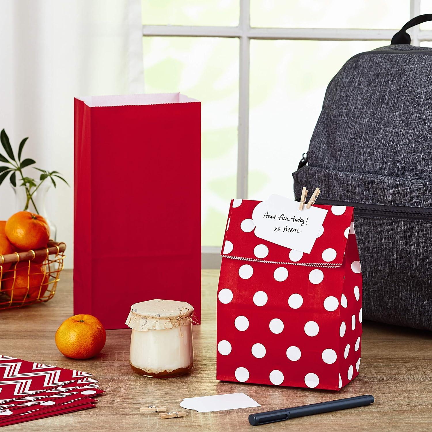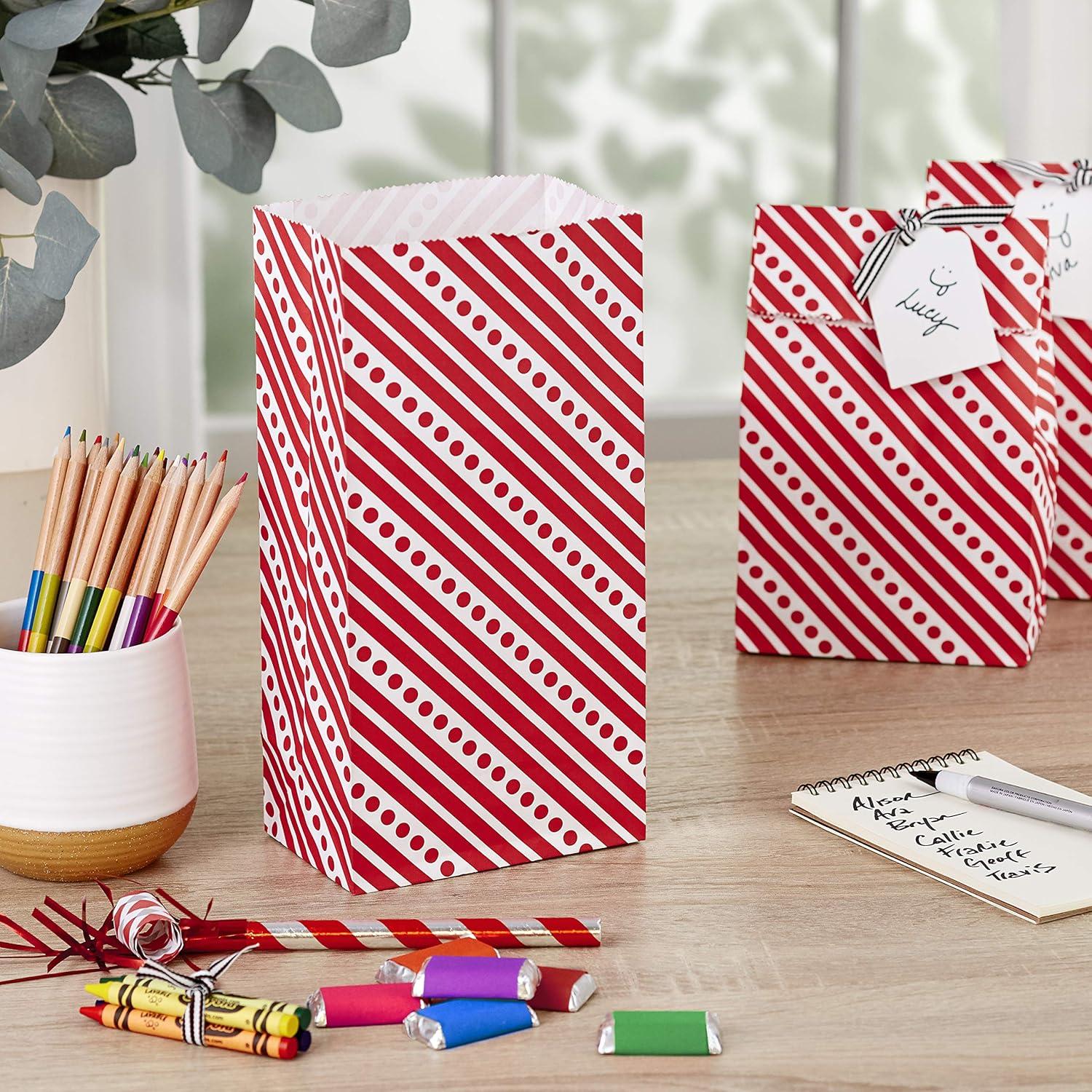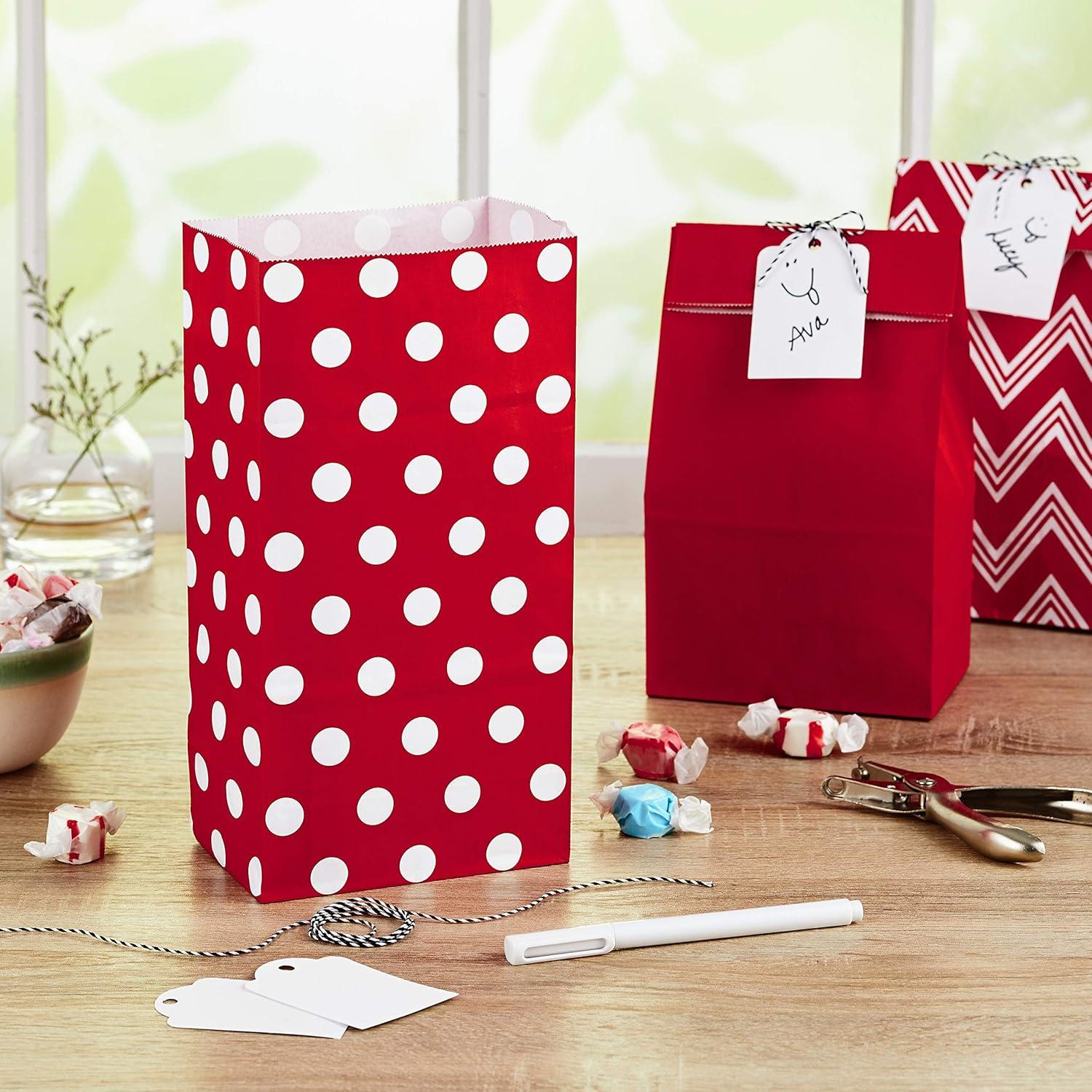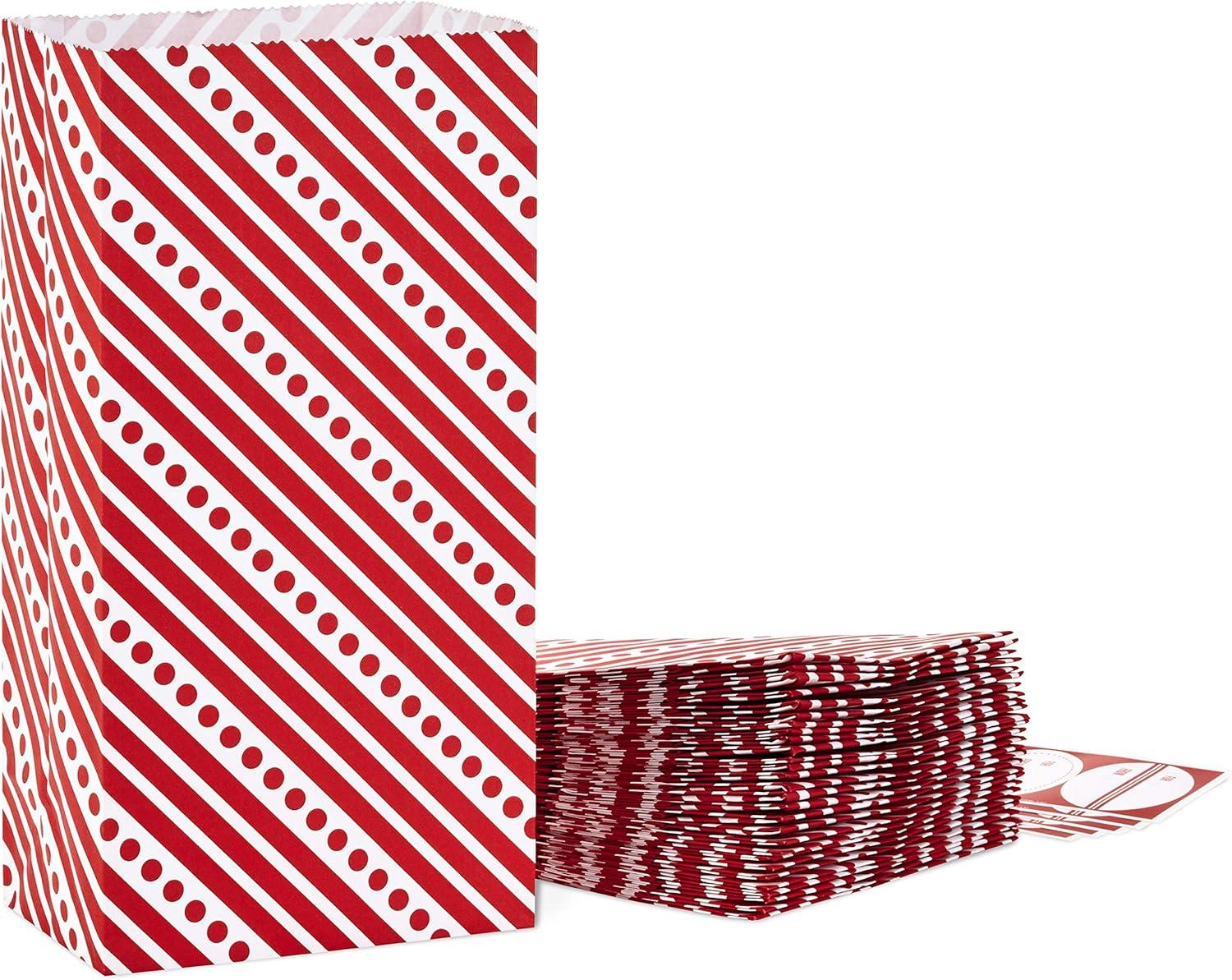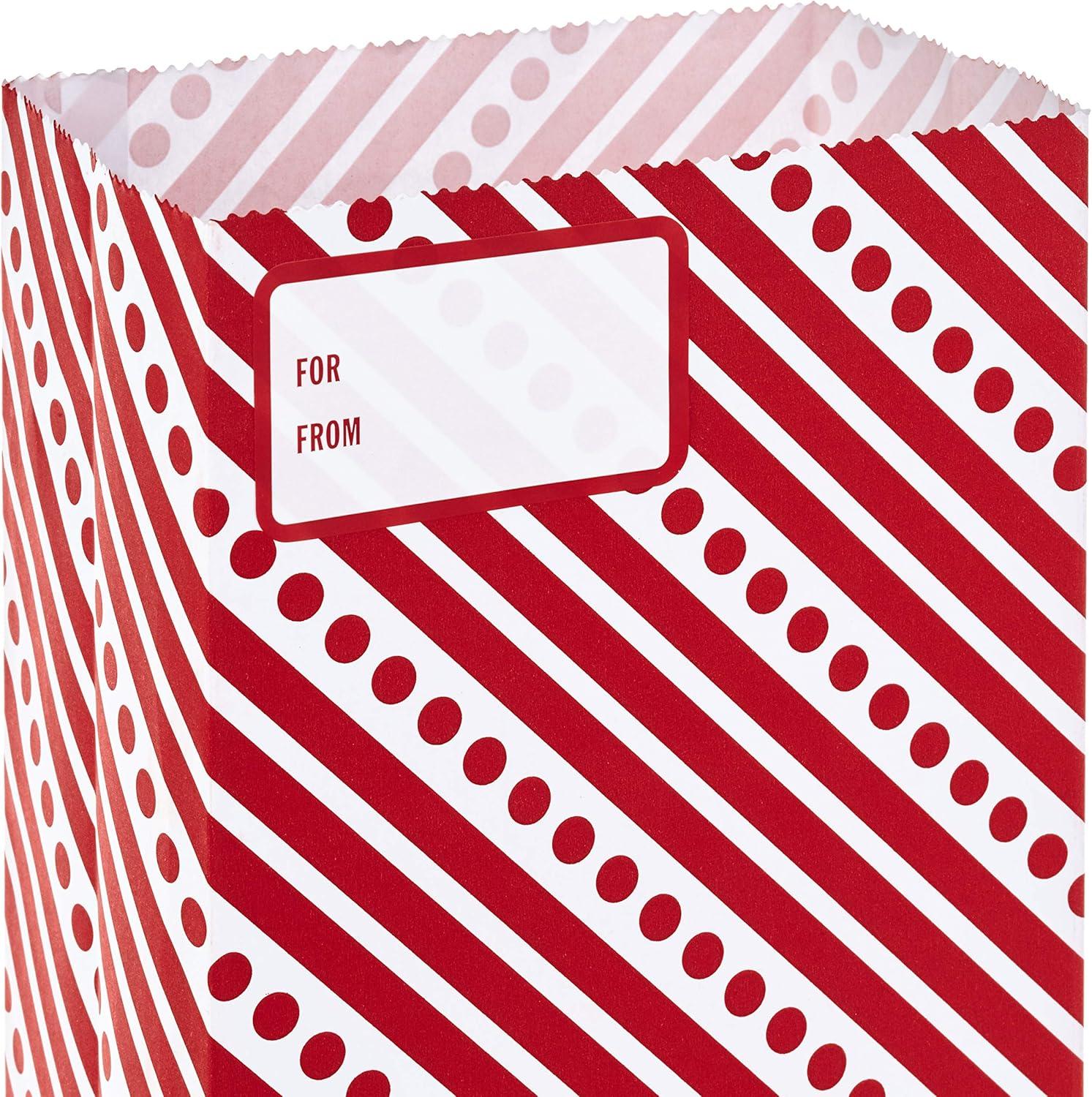 Hallmark Red Party Favor and Wrapped Treat Bags, Assorted Designs (30 Ct., 10 Each of Chevron, White Dots, Solid) for Christmas, Valentines Day, Sweetest Day, May Day, Mothers Day, Care Packages(Red Stripes with Label)