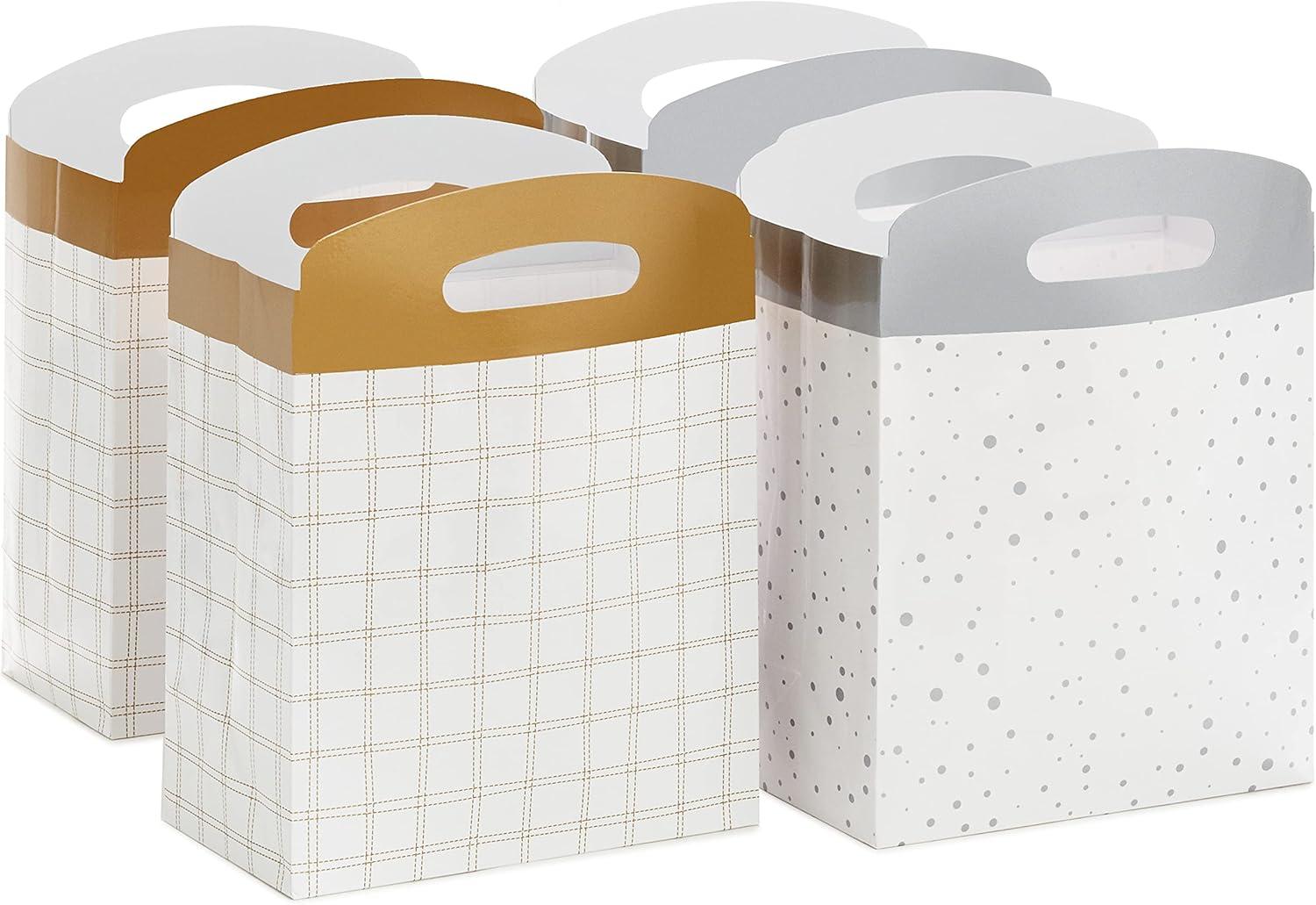 Hallmark Medium Self-Sealing Gift Bags with Handles (4 Bags, 2 Designs: Gold Stripes, Silver and White Diamonds) for Weddings, Anniversaries, Graduations, Any Occasion(Gold Plaid & Silver Dots)
