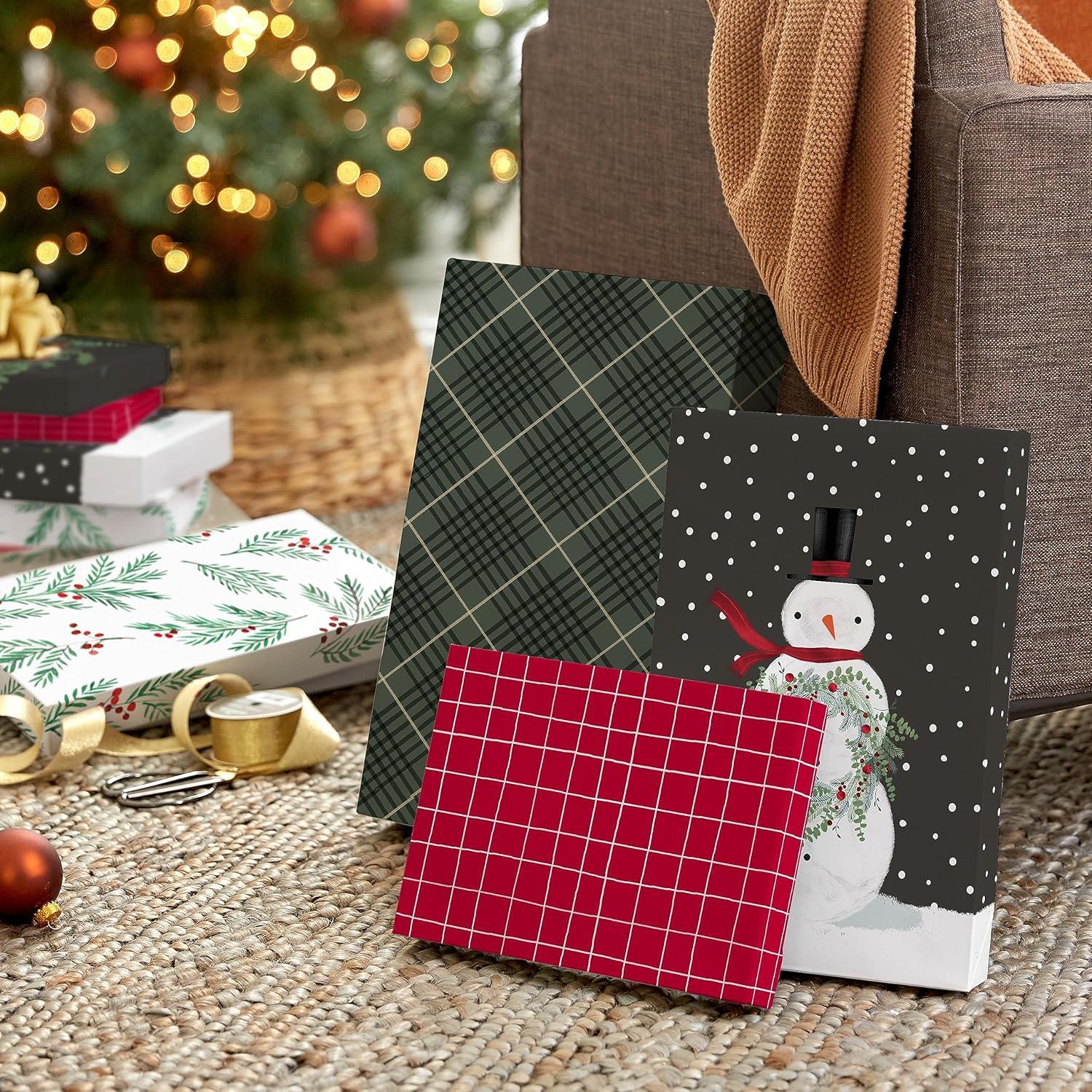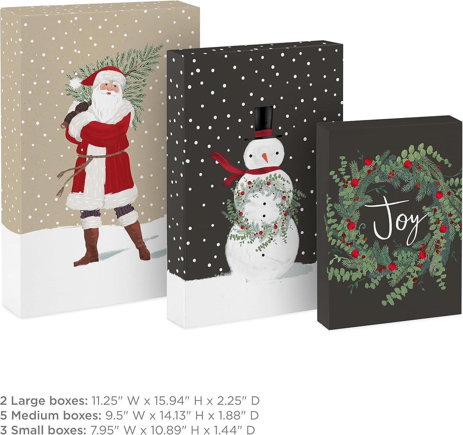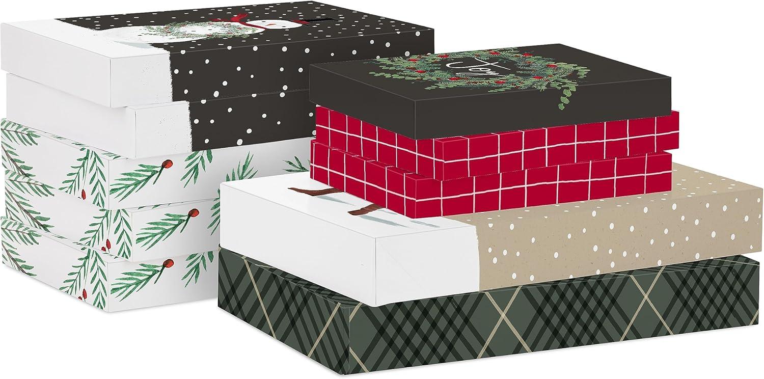 Hallmark Christmas Shirt Boxes for Presents (10 Clothes Boxes with Lids: 3 Small 11″, 5 Medium 14″, 2 Large 16″) Red, Green and Black Plaid, Snowmen, Santa, Winter Greenery