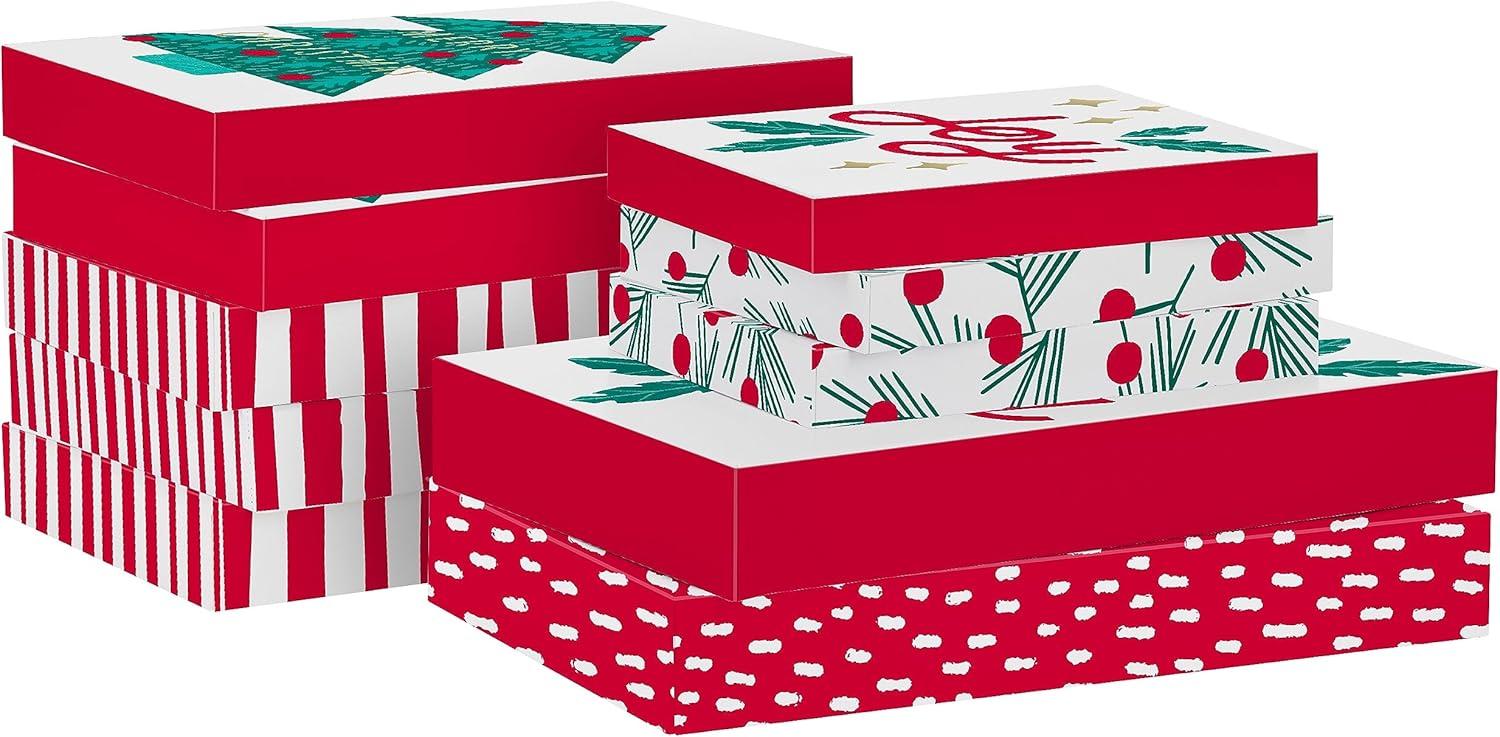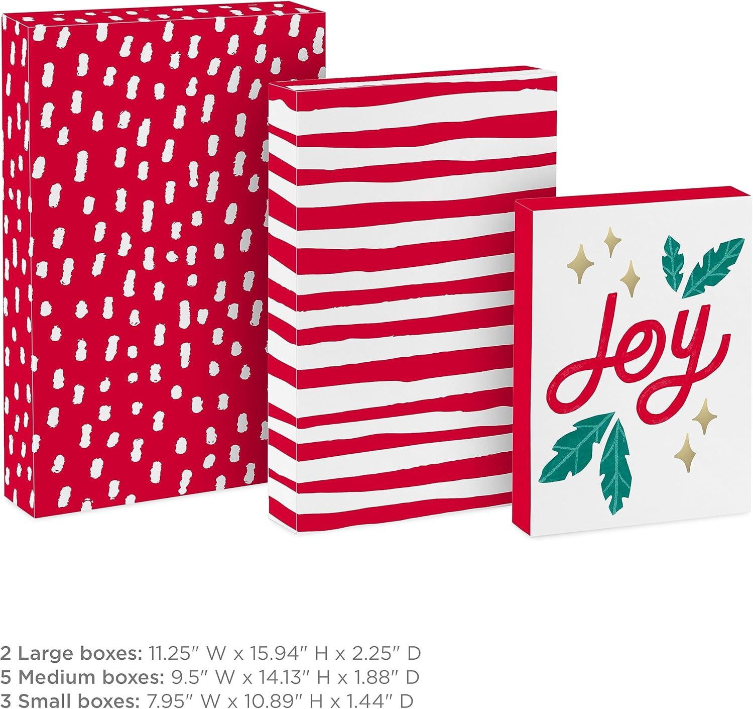 Hallmark Christmas Shirt Boxes for Presents (10 Clothes Boxes with Lids: 3 Small 11″, 5 Medium 14″, 2 Large 16″) Red and White Stripes, Green Tree with Rainbows, Joy, Very Merry