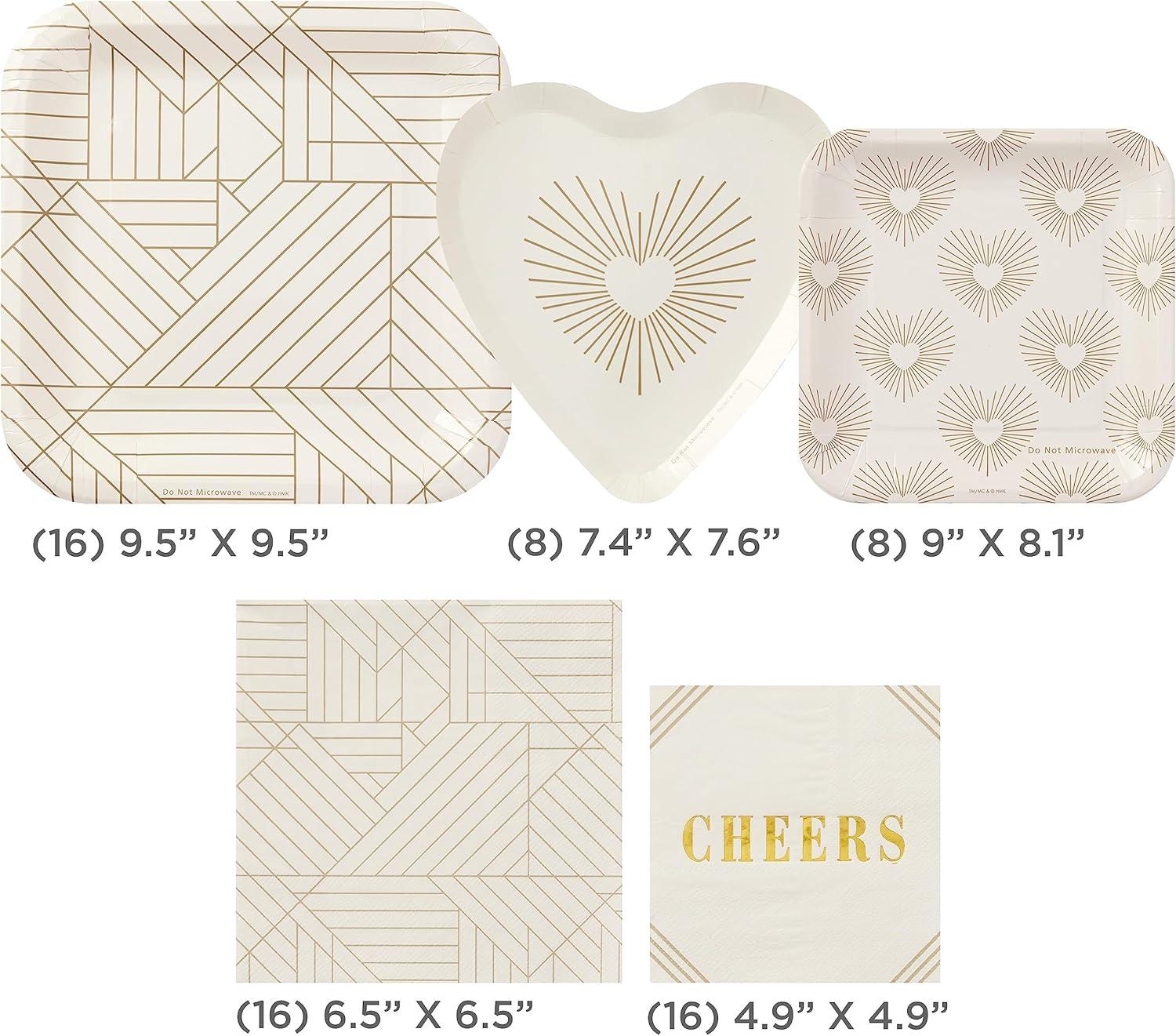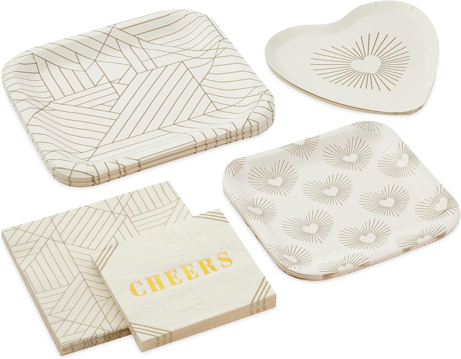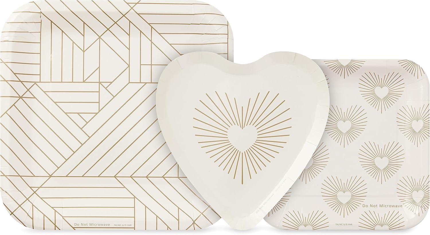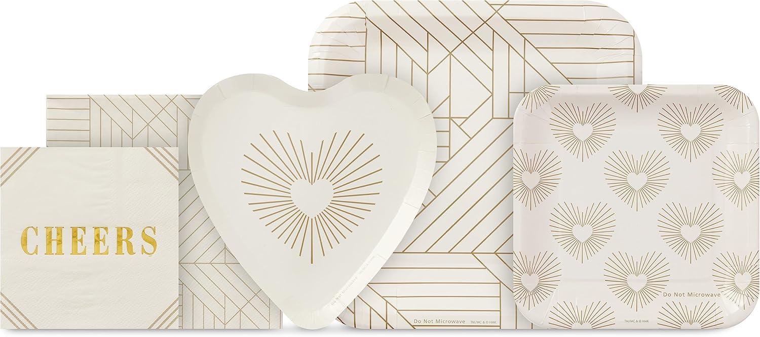 Hallmark Black and Gold Party Supplies (16 Round Dinner Plates, 16 Round Dessert Plates, 16 Beverage Napkins, 16 Dinner Napkins) for Weddings, Graduations, Engagements(Gold and Ivory Hearts Geometric)