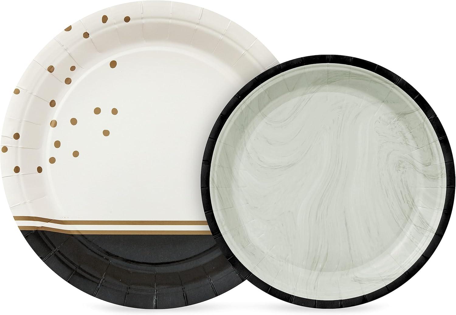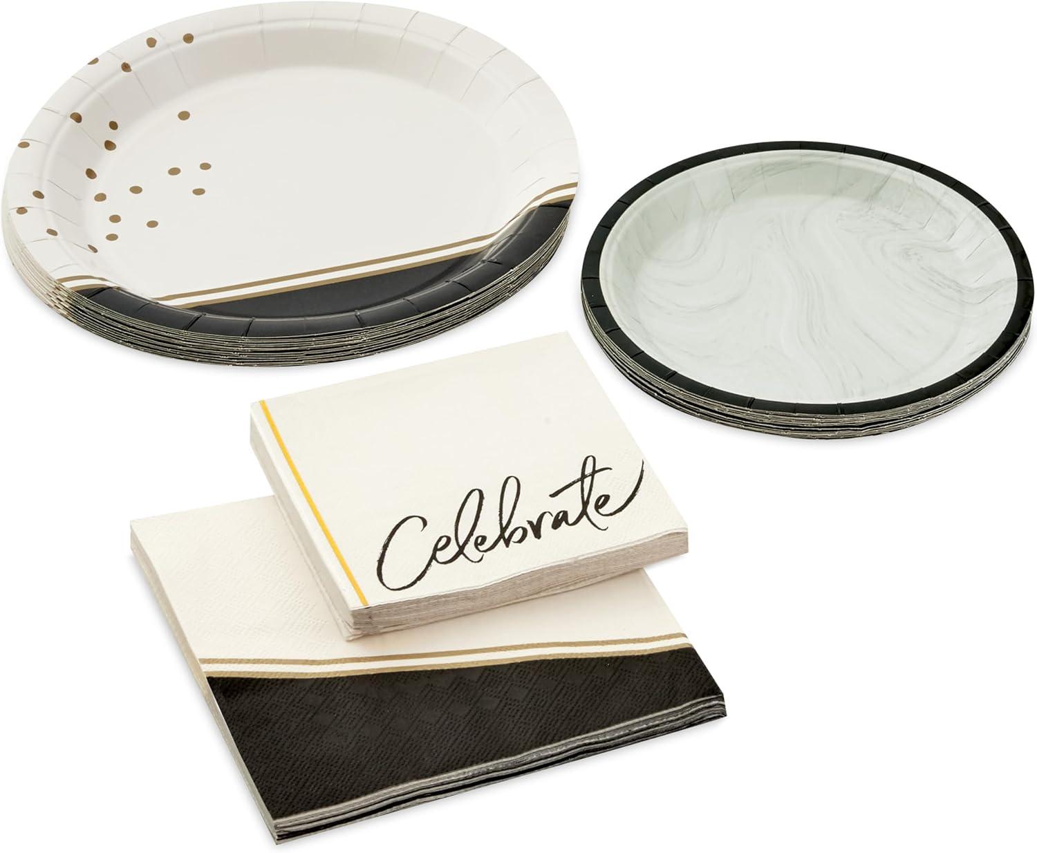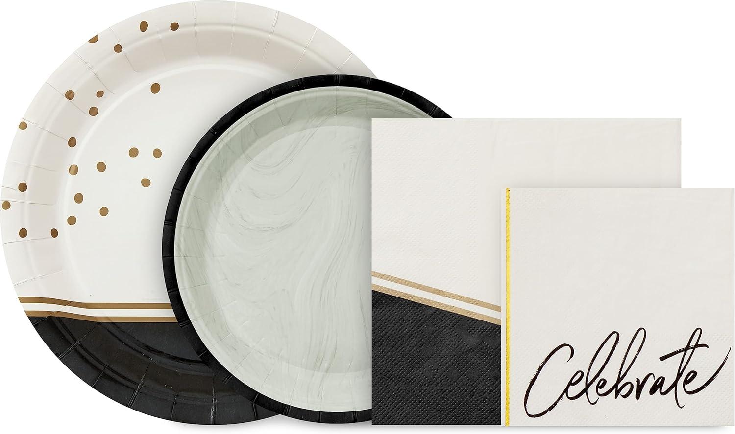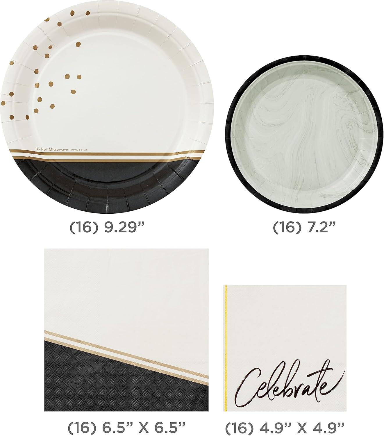 Hallmark Black and Gold Party Supplies (16 Round Dinner Plates, 16 Round Dessert Plates, 16 Beverage Napkins, 16 Dinner Napkins) for Weddings, Graduations, Engagements(Chic Black Ivory Gold)