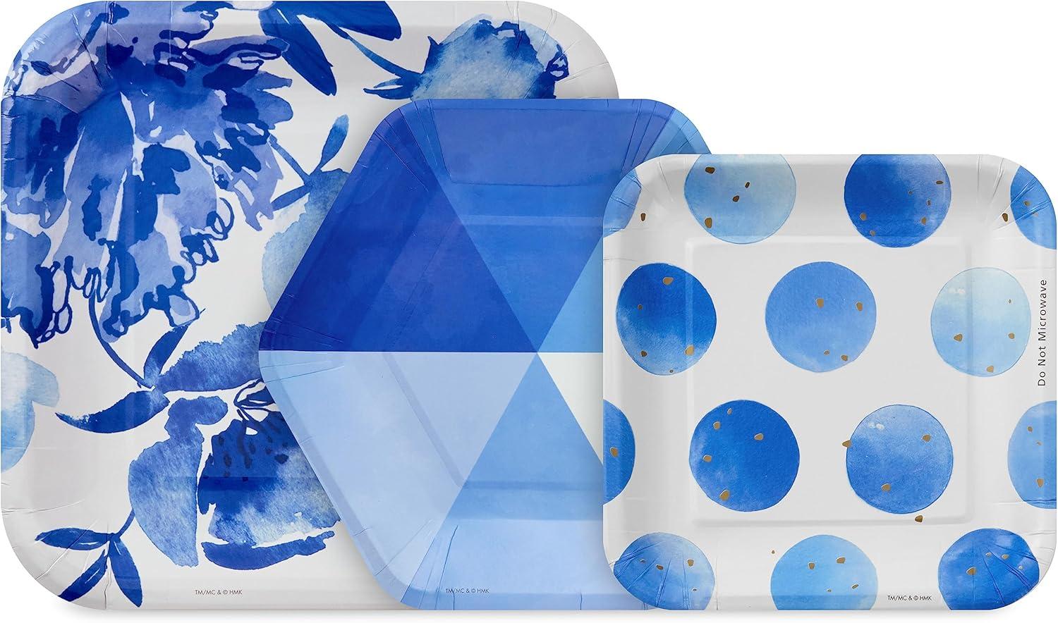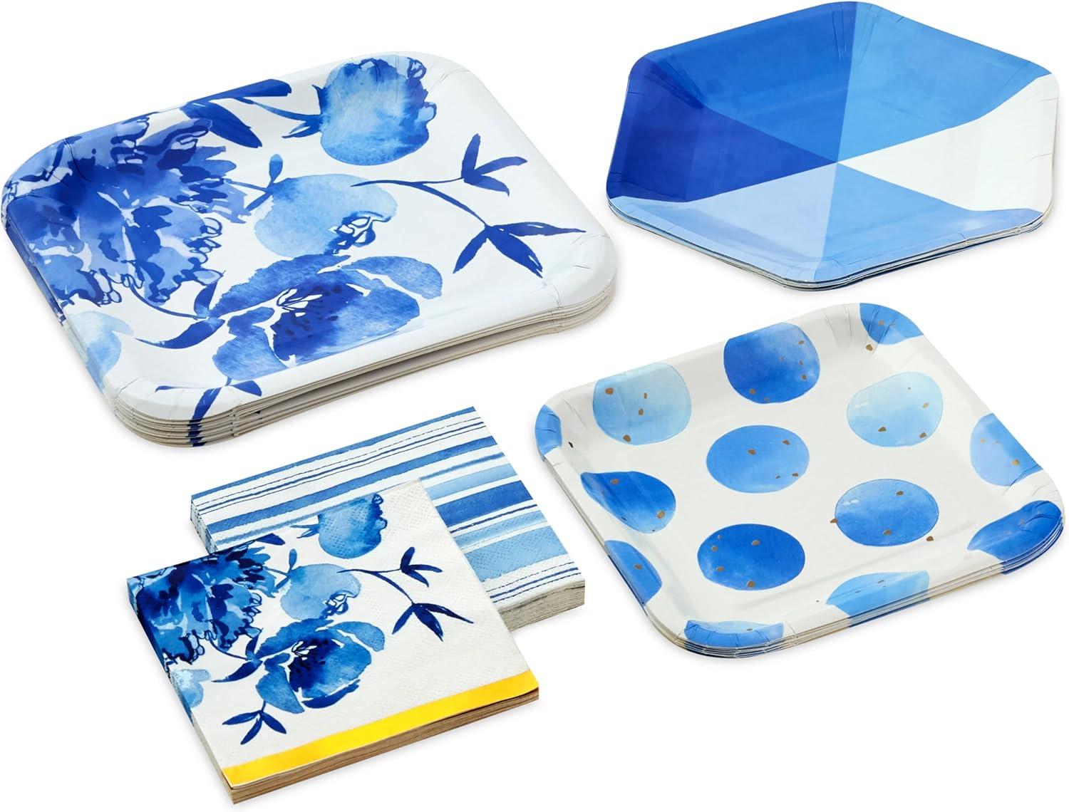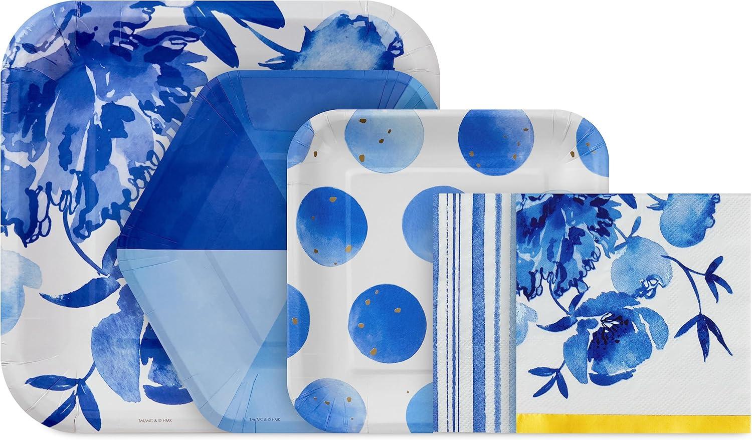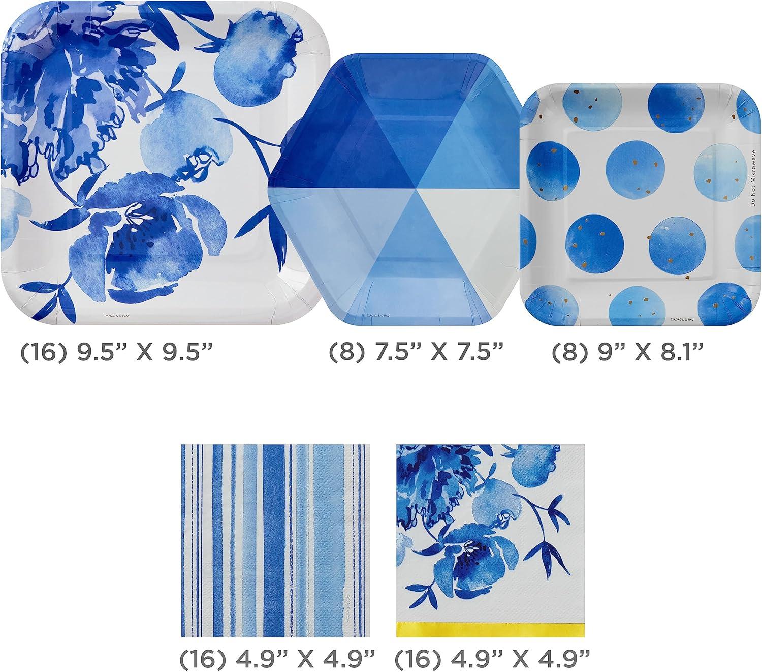 Hallmark Blue Floral Party Supplies (16 Square Dinner Plates, 8 Square Dessert Plates, 8 Hexagonal Dessert Plates, 32 Beverage Napkins) Flowers, Stripes, Polka Dots