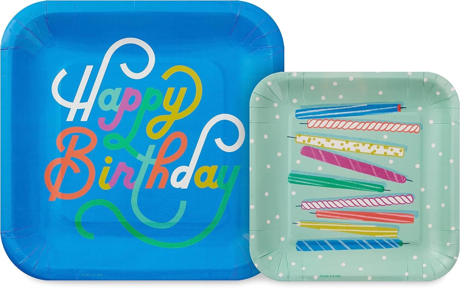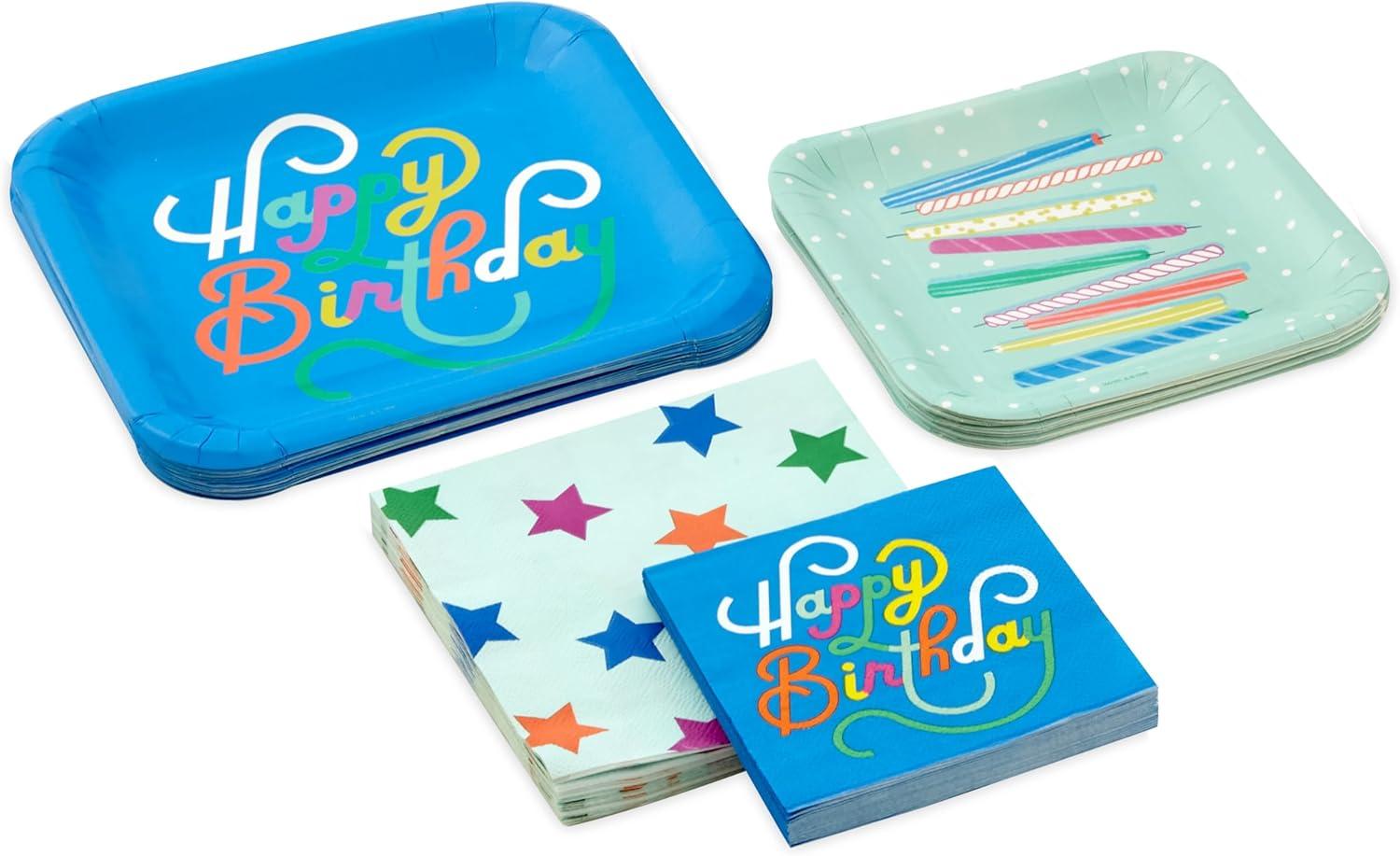 Hallmark Blue and Mint Green Birthday Party Supplies (16 Square Dinner Plates, 16 Square Dessert Plates, 16 Beverage Napkins, 16 Dinner Napkins) Stars and Candles