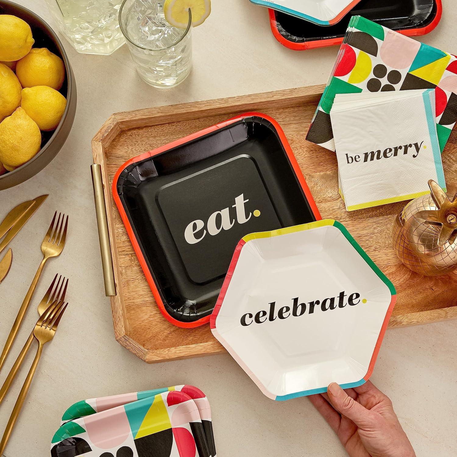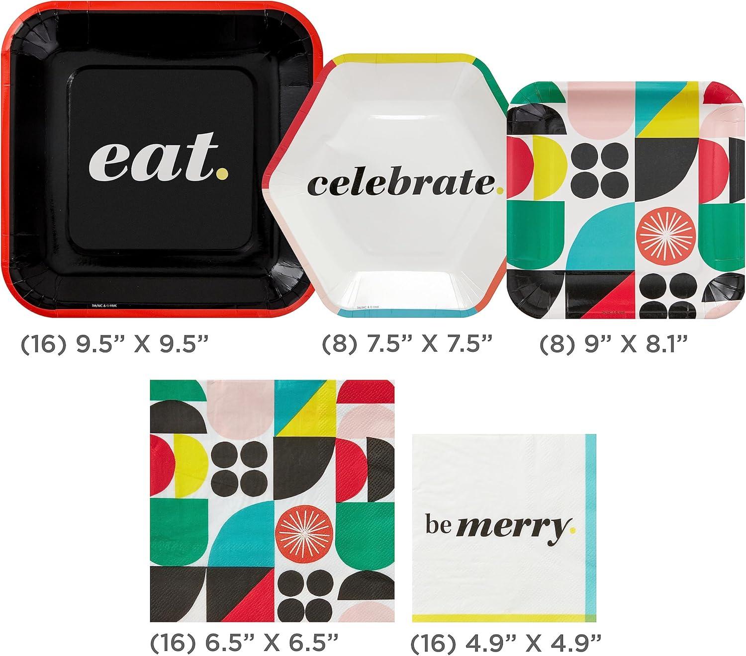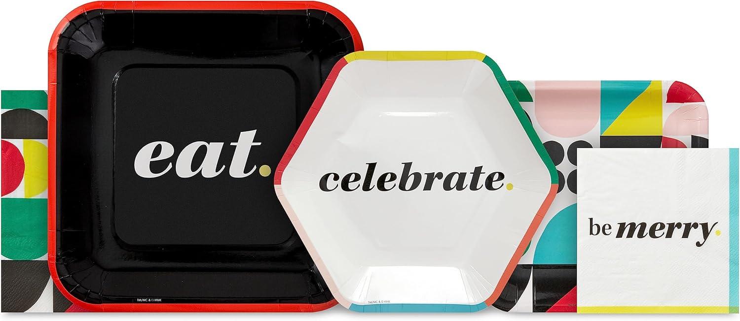 Hallmark Bold Black, White and Red Party Supplies (16 Dinner Plates, 8 Square Dessert Plates, 8 Hexagonal Dessert Plates, 16 Dinner Napkins, 16 Beverage Napkins) “Eat, Celebrate, Be Merry”