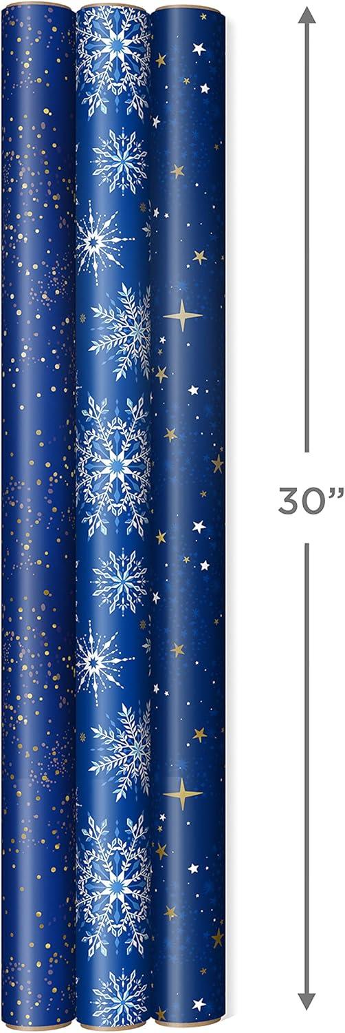 Hallmark Christmas Wrapping Paper Rolls, Metallic Foil Holiday Gift Wrap (Pack of 3: 60 sq. ft. ttl) Elegant Navy Blue and Gold for Christmas, Hanukkah, Weddings, Graduations(Navy Dots Snowflakes Stars)