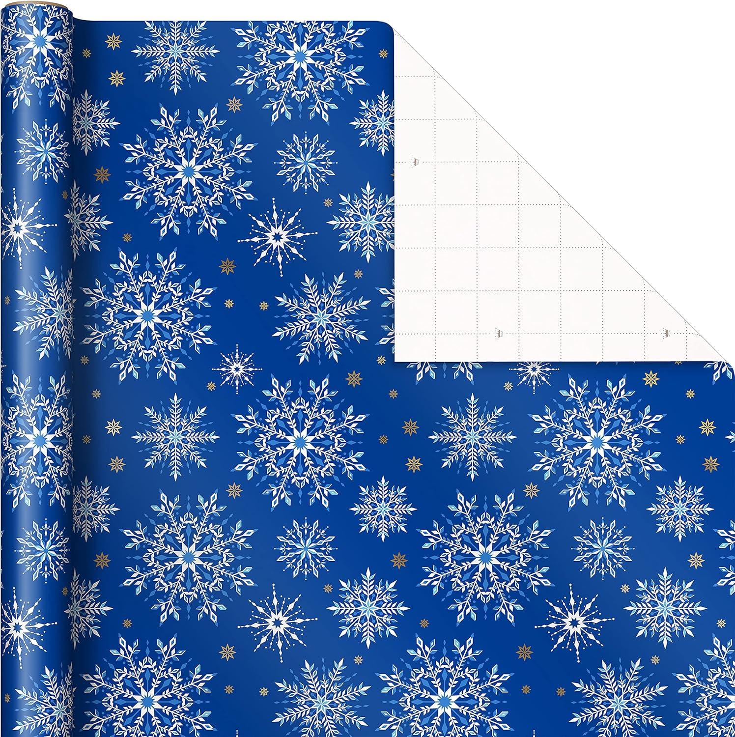 Hallmark Christmas Wrapping Paper Rolls – Minimalist Brown Kraft Trees, Antlers, Snowflakes Gift Wrap Paper (3 Rolls: 90 sq. ft. ttl.) for Holiday Parties, Hanukkah, Winter Weddings(Snowflakes Blue and Green Foliage Trees)