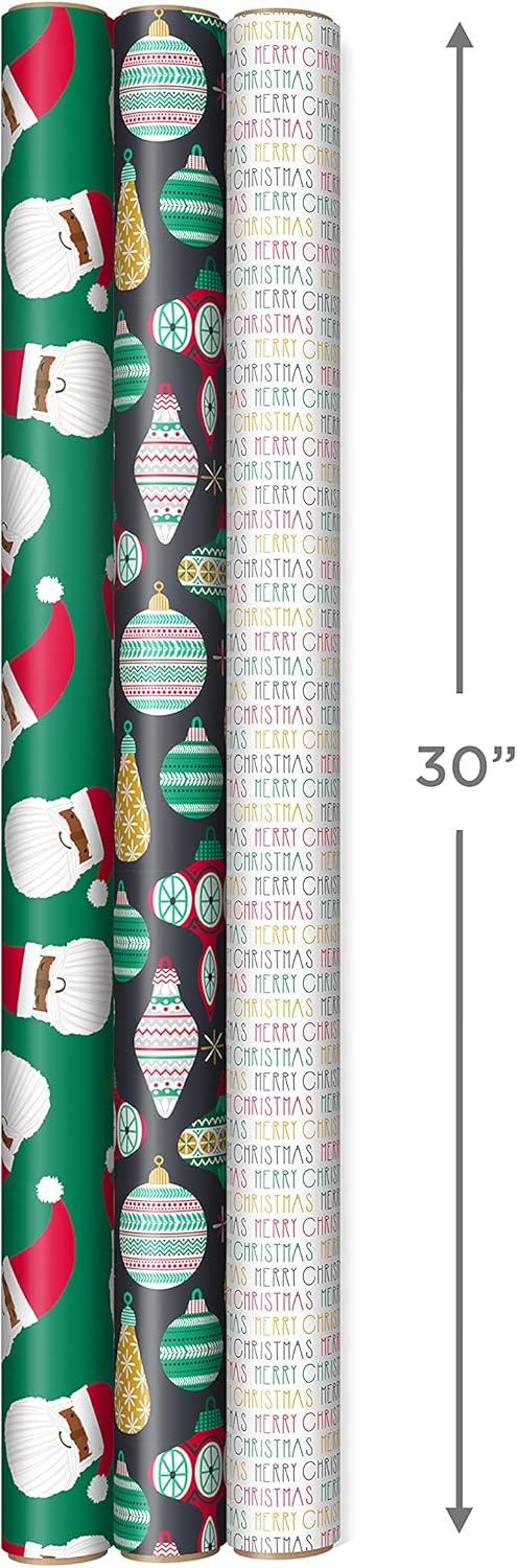 Hallmark Christmas Wrapping Paper with Cutlines on Reverse (3 Rolls: 90 Sq. Ft. Total) Santa Claus, Polka Dots, Snowmen(Multicultural Santa Claus Ornaments “Merry Christmas”)