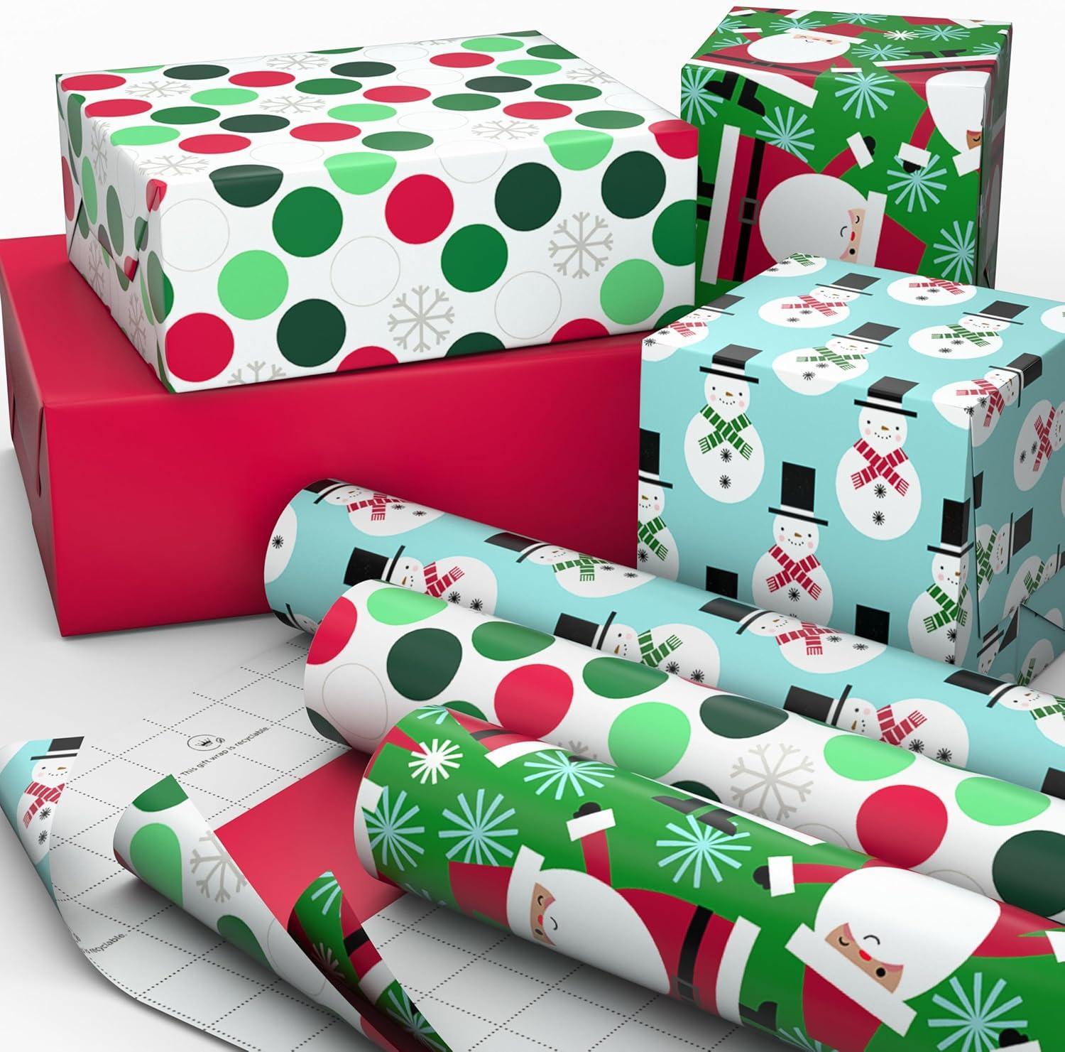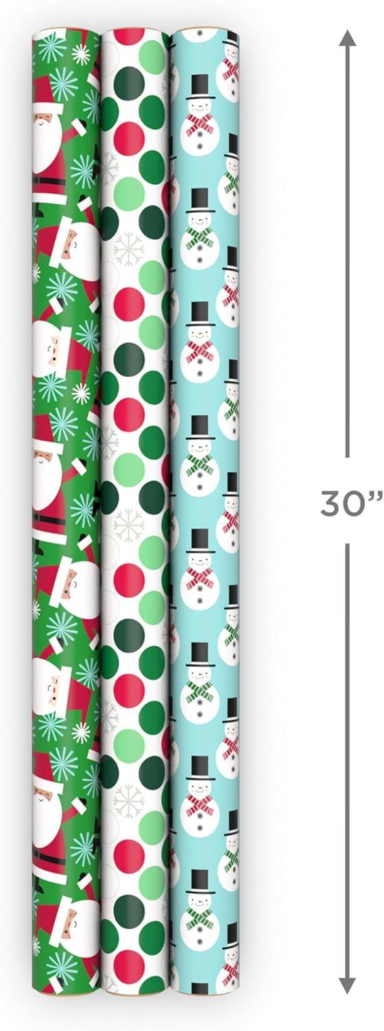 Hallmark Christmas Wrapping Paper with Cutlines on Reverse (3 Rolls: 90 Sq. Ft. Total) Santa Claus, Polka Dots, Snowmen(Santa Claus Polka Dots Snowmen)