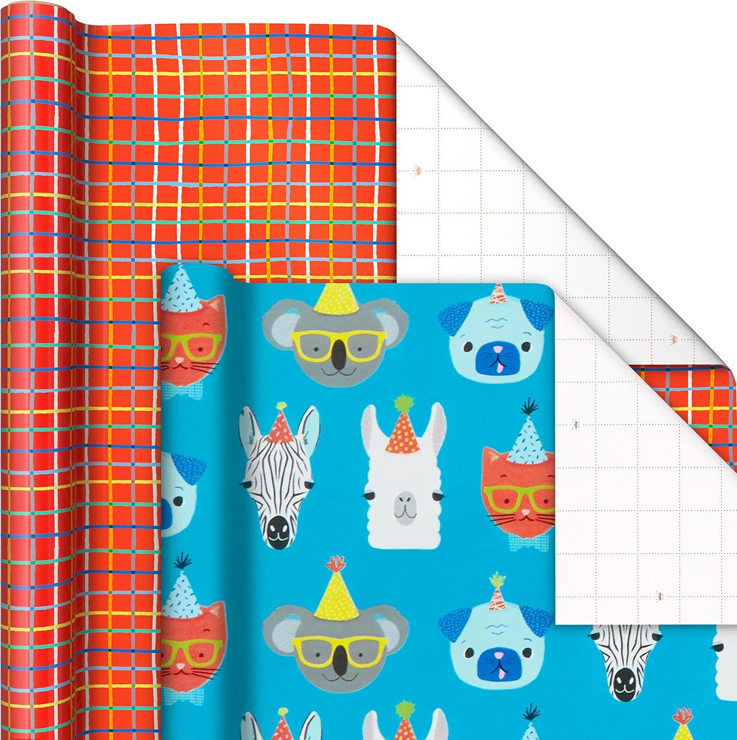 Hallmark Colorful Wrapping Paper Bundle with Cutlines on Reverse (6 Rolls: 110 Square Feet Total) Llamas, Zebras, Cupcakes, Holographic Stripes, Polka Dots for Birthdays, Kids Parties, Back to School(Cats and Dogs Stripes Cupcakes Grid Polka Dots)