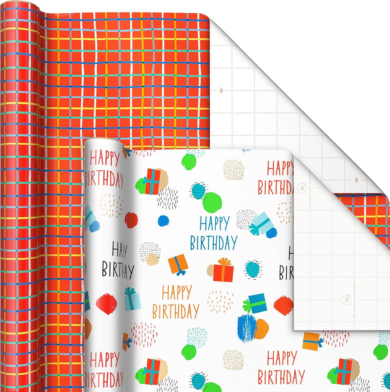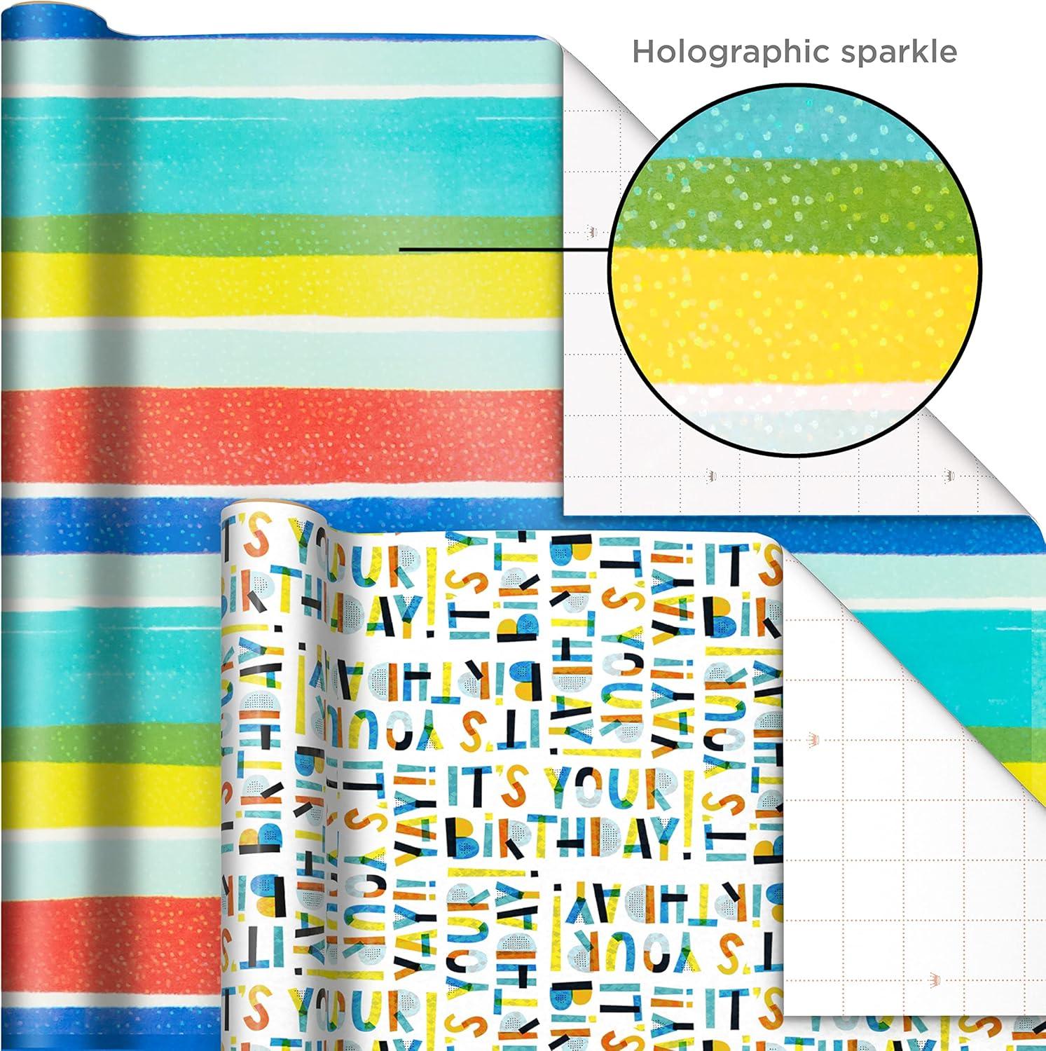 Hallmark Colorful Wrapping Paper Bundle with Cutlines on Reverse (6 Rolls: 110 Square Feet Total) Llamas, Zebras, Cupcakes, Holographic Stripes, Polka Dots for Birthdays, Kids Parties, Back to School(Stripes Polka Dots Grid Birthday Candles)