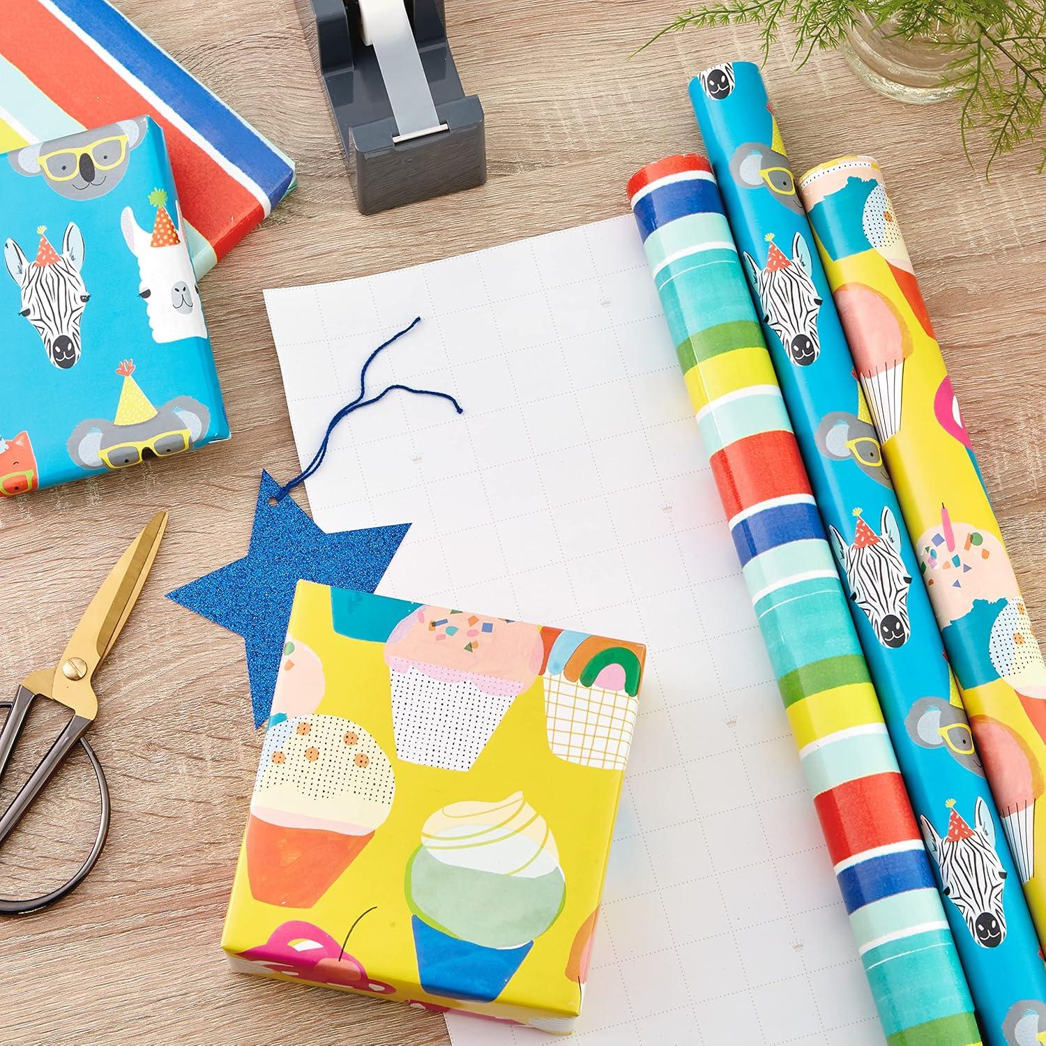 Hallmark Colorful Wrapping Paper Bundle with Cutlines on Reverse (6 Rolls: 110 Square Feet Total) Llamas, Zebras, Cupcakes, Holographic Stripes, Polka Dots for Birthdays, Kids Parties, Back to School(Metallic Blue and Gold)