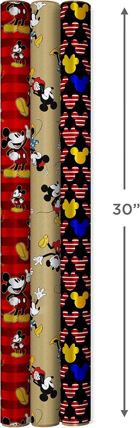 Hallmark Disney Mickey Mouse Wrapping Paper with Cut Lines on Reverse (3-Pack: 60 sq. ft. ttl) for Birthdays, Christmas, Hanukkah, Baby Showers and More(Red Brown Black)
