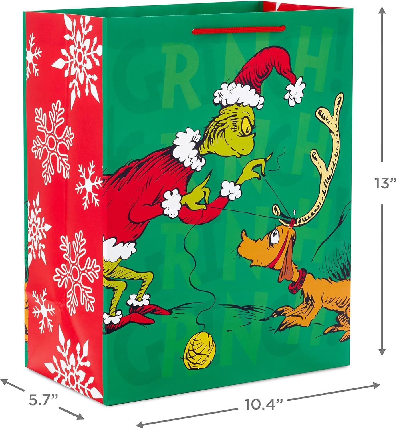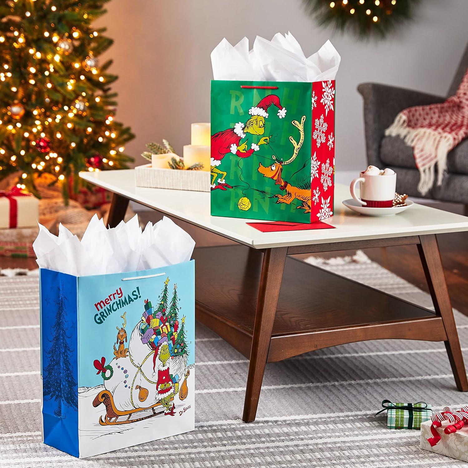 Hallmark Dr. Seuss Grinch Wrapping Paper for Kids (3 Rolls: 105 Sq. Ft. Ttl) for Christmas with Blue Tiles, White Snowflakes, Cindy Lou Who, Max(Gift Bags)