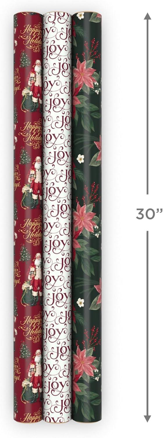 Hallmark Elegant Christmas Wrapping Paper Rolls (3 Rolls: 120 Sq. Ft. Total) Red Joy on White, Santa Claus and Happy Holidays on Red, Painted Poinsettia on Hunter Green(Elegant Christmas)
