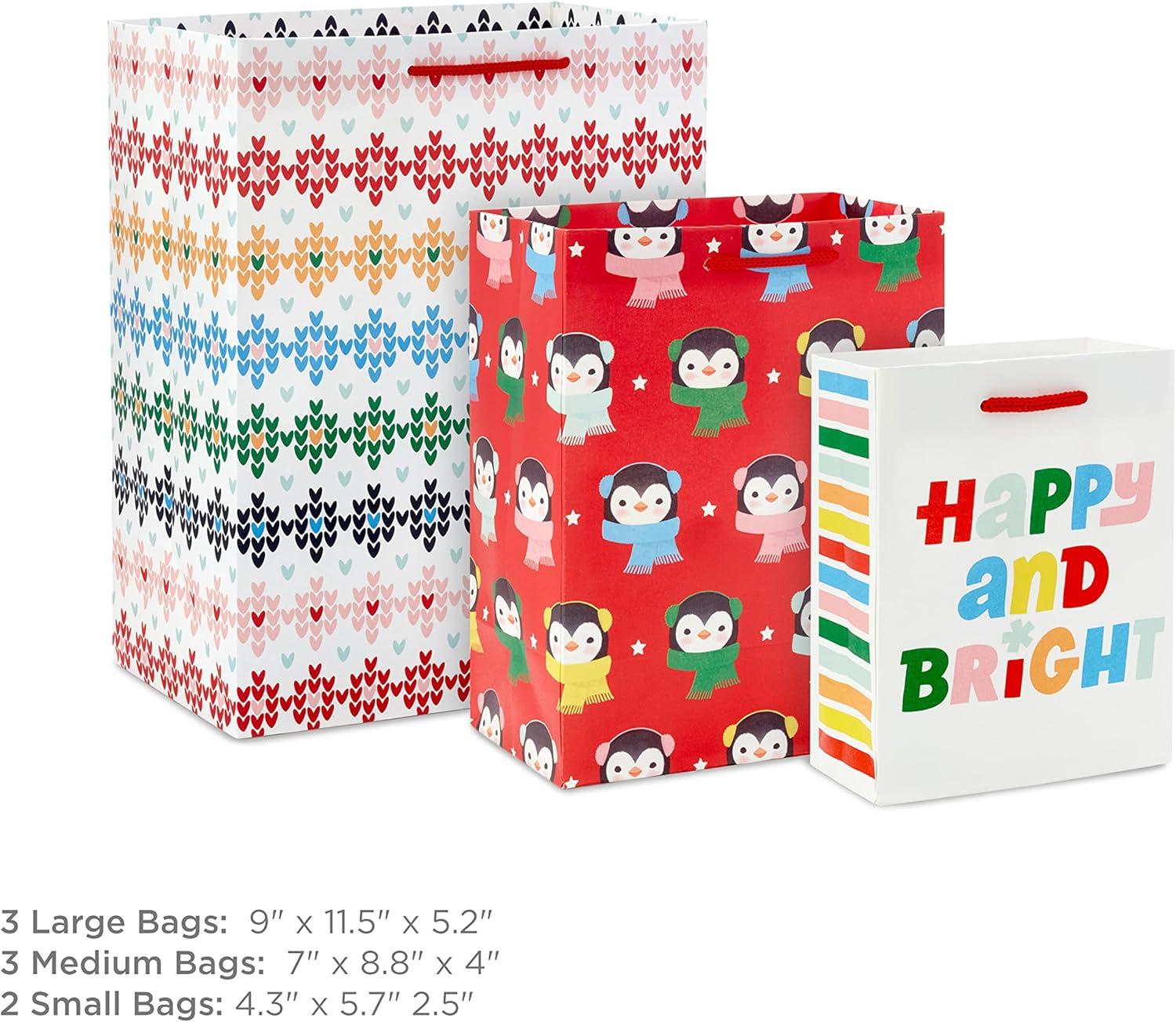 Hallmark Christmas Gift Bag Assortment (8 Bags: 2 Small 5″, 3 Medium 8″, 3 Large 11″) Pink, Mint Green, Red, Blue, Yellow, “Merry Everything,” “Let It Snow,” “Happy Bright,” Penguins, Snowmen, Santa