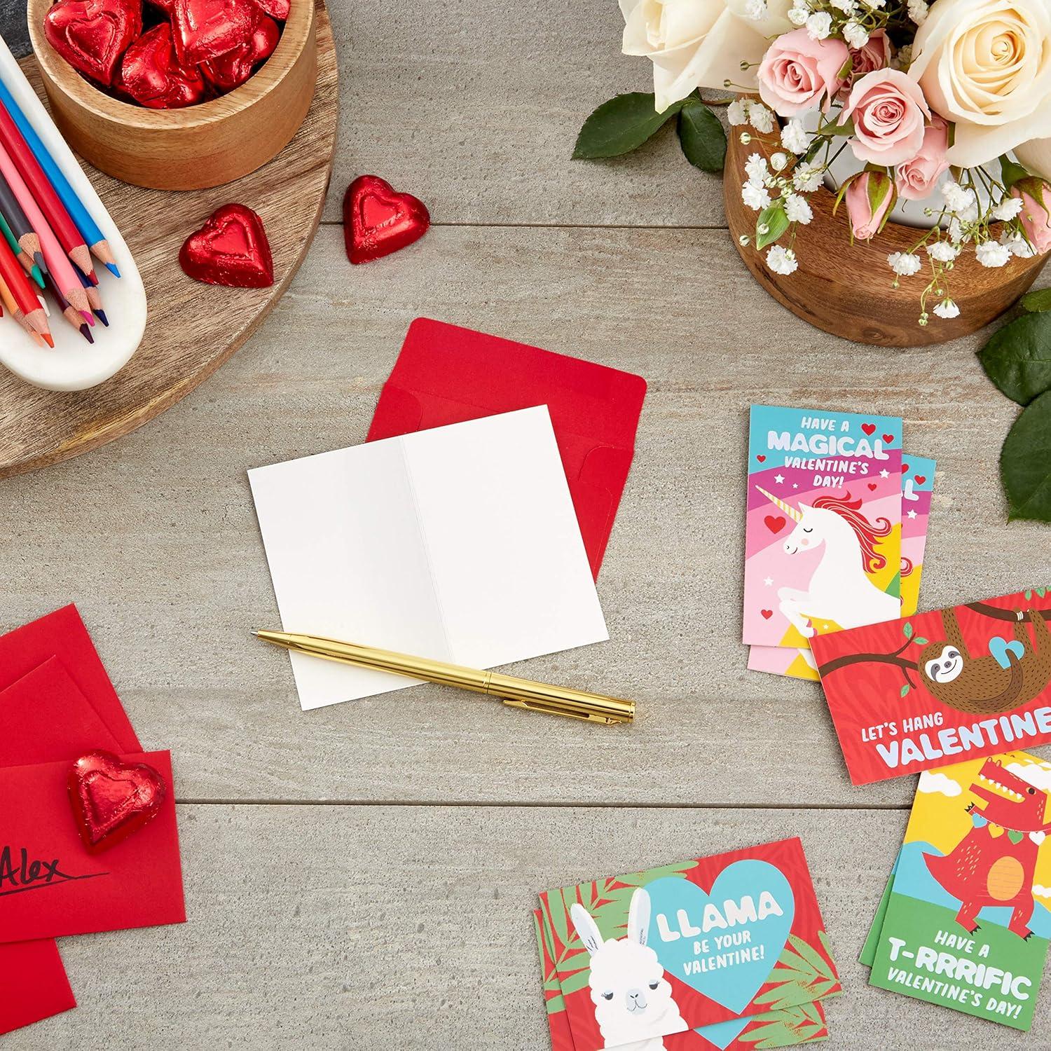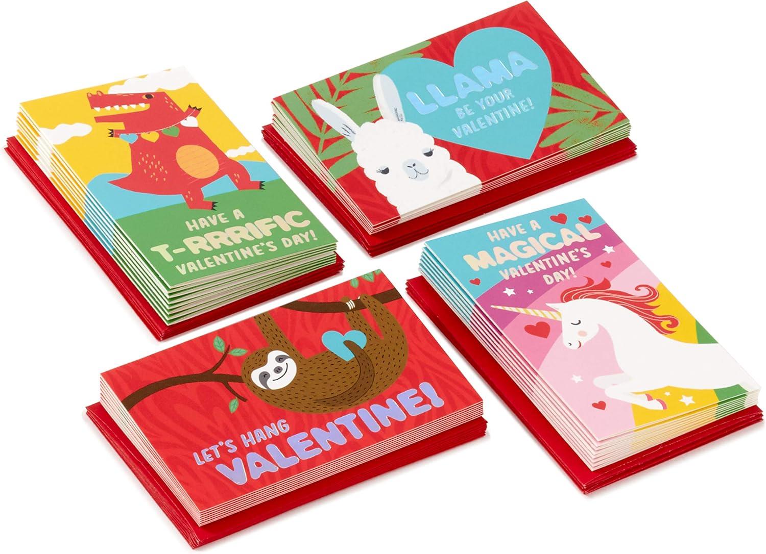 Hallmark Mini Valentines Day Cards for Kids School, Llama, Sloth, Dinosaur, Unicorn (32 Classroom Valentines with Envelopes)(Kid Animal Puns Folded Mini Valentines)