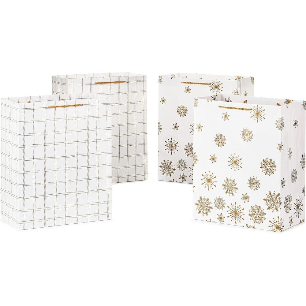 Share more merry! Add joy to the holiday season with a set of large gift bags with coordinating handles. Fancy 4-pack of Christmas gift bags includes 2 each of 2 designs: White with cascading gold snowflakes and white with gold windowpane plaid. Perfect for wrapping presents like clothing, books, photo frames or a collection of smaller items for your husband, wife, coworkers, teachers, neighbors, and more. Great to have on hand for Hanukkah, Christmas, winter solstice, weddings, graduations, retirements, anniversaries, Valentine's Day, birthdays, or other elegant occasions. The Hallmark brand is widely recognized as the very best for greeting cards, gift wrap, and more. For more than 100 years, Hallmark has been helping its customers make everyday moments more beautiful and celebrations more joyful.