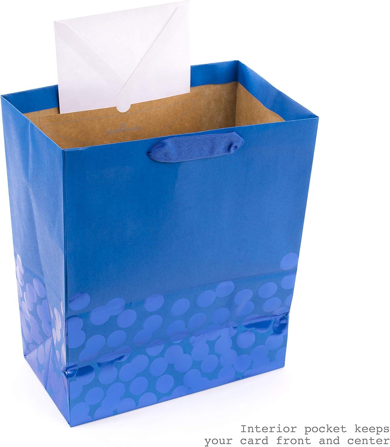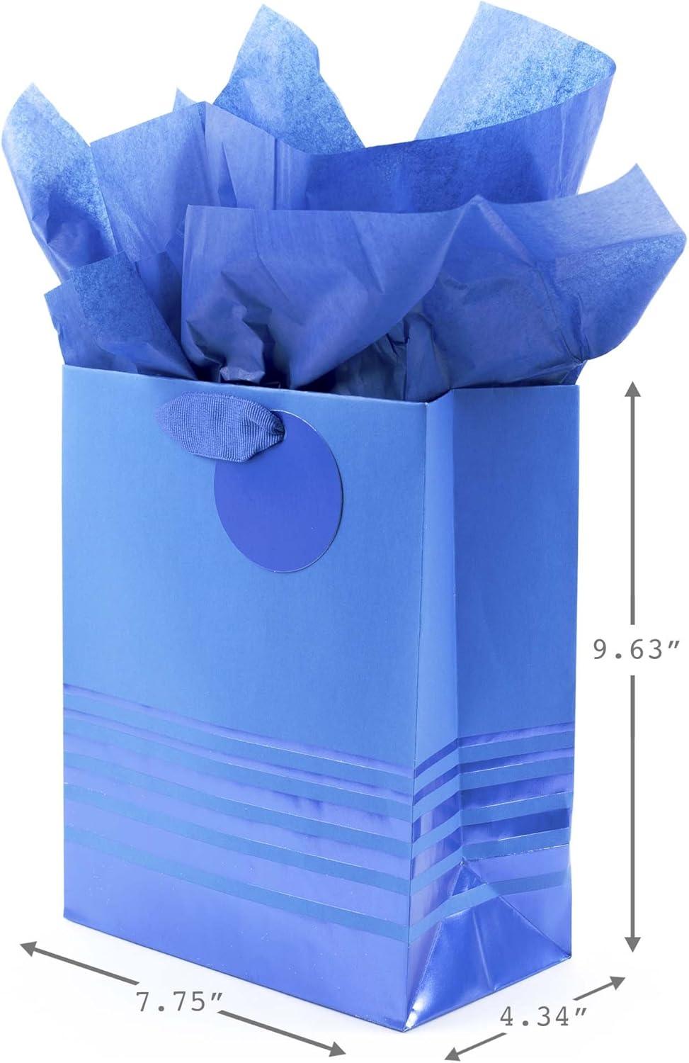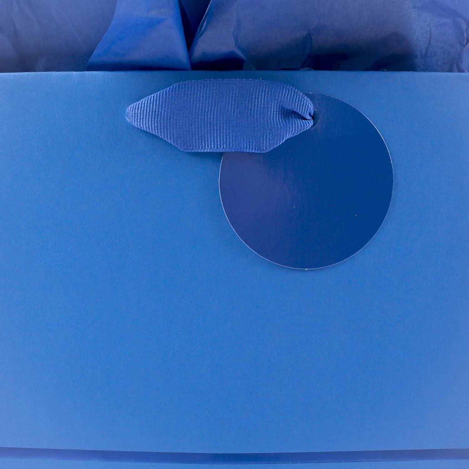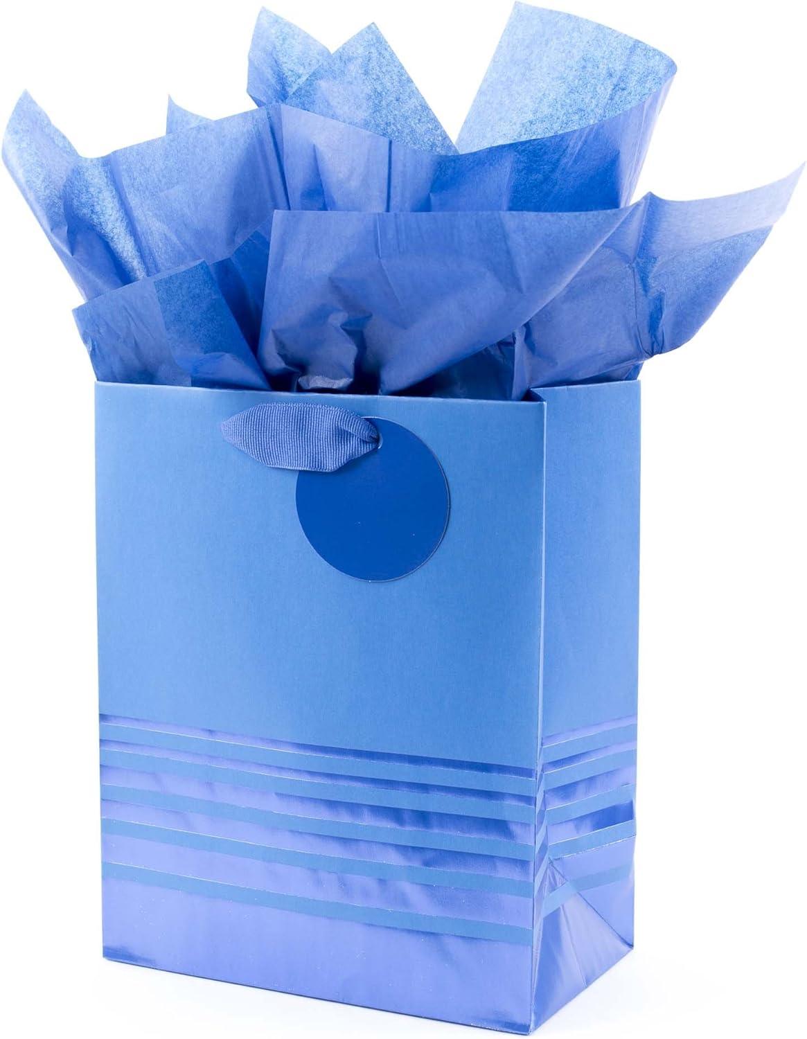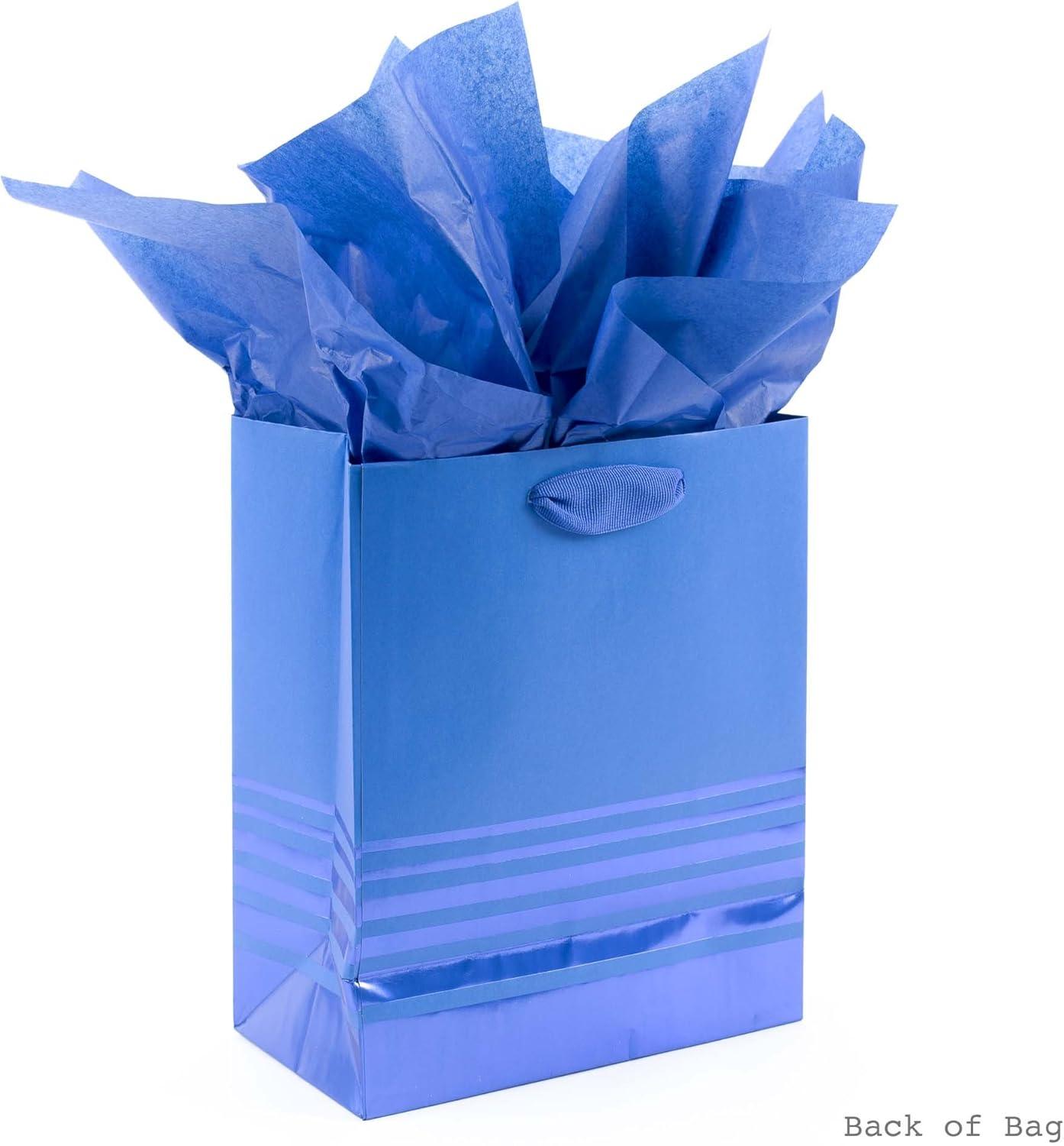 Large bag features a striking two-tone blue design with metallic foil polka dots, foil gift tag and blue grosgrain fabric ribbon handles. Top with the coordinating bright blue tissue paper included. Large gift bag measures 10.47 inches wide by 13 inches high by 5.75 inches deep and can hold presents like books, clothing, stuffed animals, puzzles or action figures. Supports up to 10 pounds. Crafted from high-quality materials, Hallmark gift bags are made with paper from well-managed forests. Perfect for presenting Father's Day, birthday, baby, graduation, and many other gifts. Purchase includes one large-size paper gift bag with gift tag, grosgrain ribbon handles and three sheets of blue tissue paper. All-in-one gift wrapping set is an easy way to wrap a present.