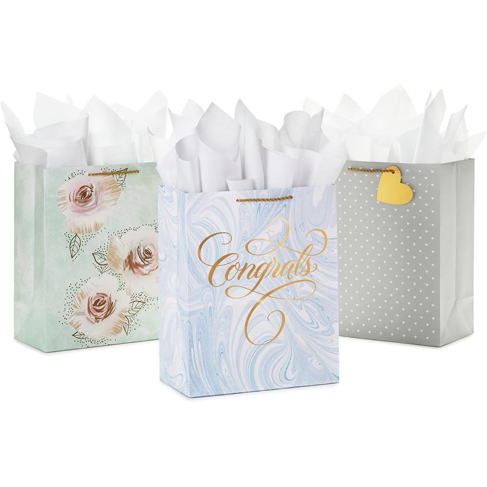 Celebrate engaged couples, newlyweds, the bride to be, or couples celebrating a wedding anniversary with this set of elegant gift bags with handles. Gift bag bundle features artistic roses on mint green, script gold lettering that reads “Congrats” on marble blue, and delicate white polka dots on cream with a gold heart gift tag. Purchase includes three large gift bags with 9 sheets of white tissue paper to make wrapping gifts quick and easy. Perfect for weddings, bridal showers, engagement parties, anniversary presents and more. The Hallmark brand is widely recognized as the very best for greeting cards, gift wrap, and more. For more than 100 years, Hallmark has been helping its customers make everyday moments more beautiful and celebrations more joyful.