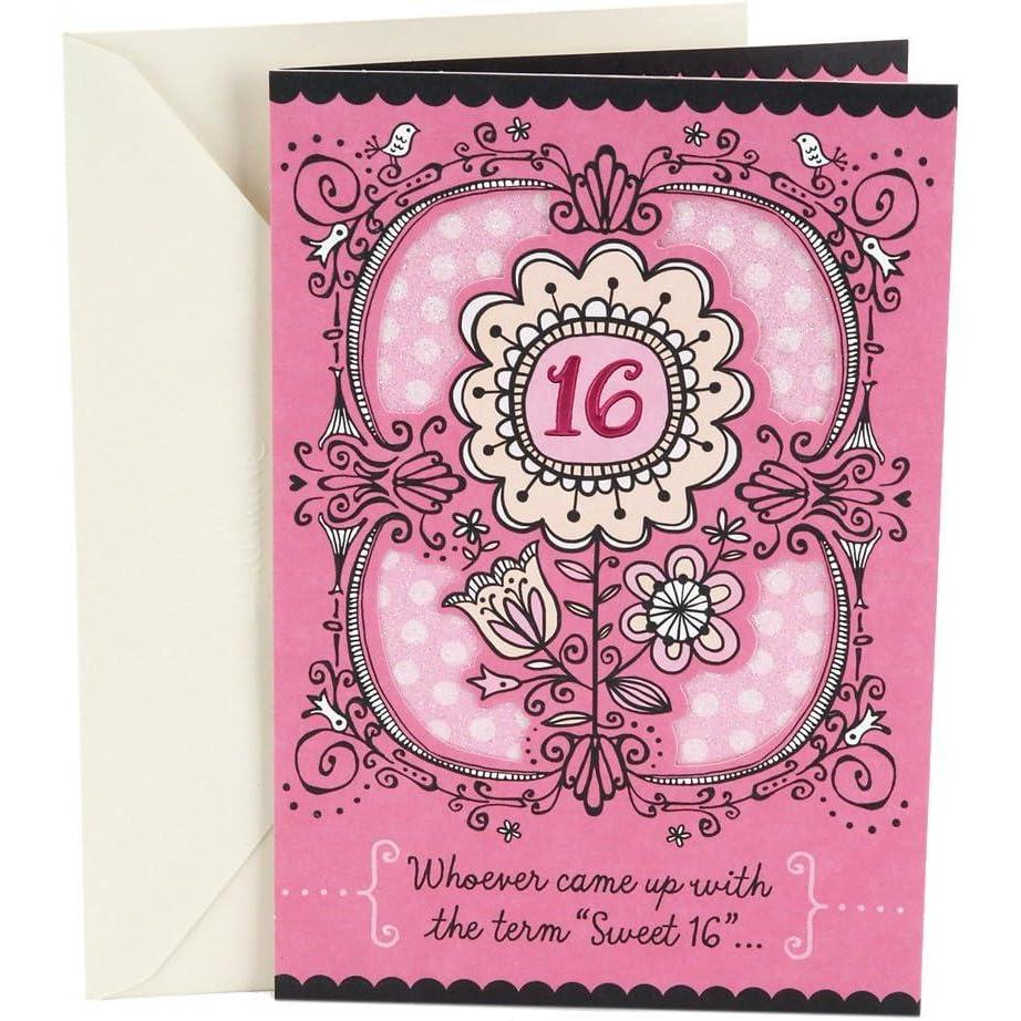 Wish a friend, family member, and more a wonderful 16th birthday with this card featuring an ornate border of floral-themed scrollwork on a deep pink background. The message on the front of the card reads, “Whoever came up with the term “Sweet 16″….” Open the card to reveal the inside message, “…must have been thinking of you. Happy 16th Birthday—Hope it's simply wonderful! ” The card measures 8.3 inches long by 5.8 inches wide made with high quality cardstock paper; an envelope is included. All Hallmark cards are made with paper from well-managed forests. Hallmark was founded in 1910 when 18-year-old J.C. Hall arrived in Kansas City, Missouri, with a couple of shoeboxes of postcards under his arm and the American dream in his heart. Hallmark greeting cards are sold online and in nearly 40,000 retail stores across the globe and people continue to recognize the iconic Hallmark brand as “the very best.”