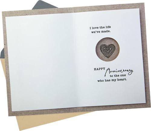 Cover features complementary black and white line-drawn hearts on a gray background. Inside reads: “I love the life we've made. Happy Anniversary to the one who has my heart.”