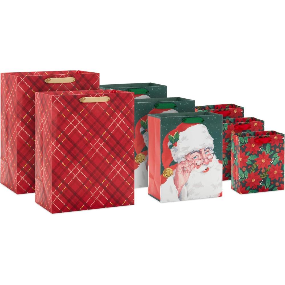 Hallmark Assorted Christmas Gift Bags (8 Bags: 3 Small 6″, 3 Medium 9″, 2 Large 13″) Santa Claus, Red Plaid, Poinsettia Flowers(Red Plaid Retro Santa Poinsettia)