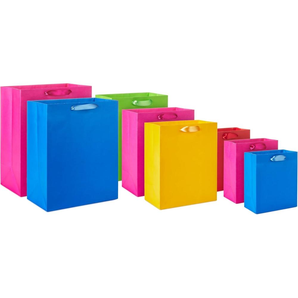 Hallmark Assorted Gift Bags (8 Bags: 3 Small 6″, 3 Medium 9″, 2 Large 13″) Solid Pink, Blue, Green, Yellow, Red(1 Count (Pack of 8))