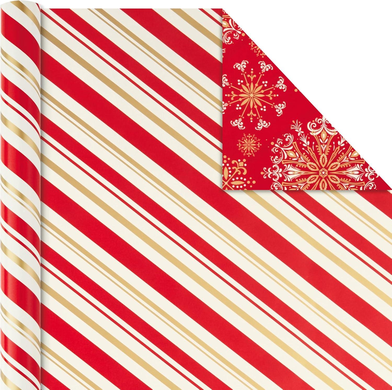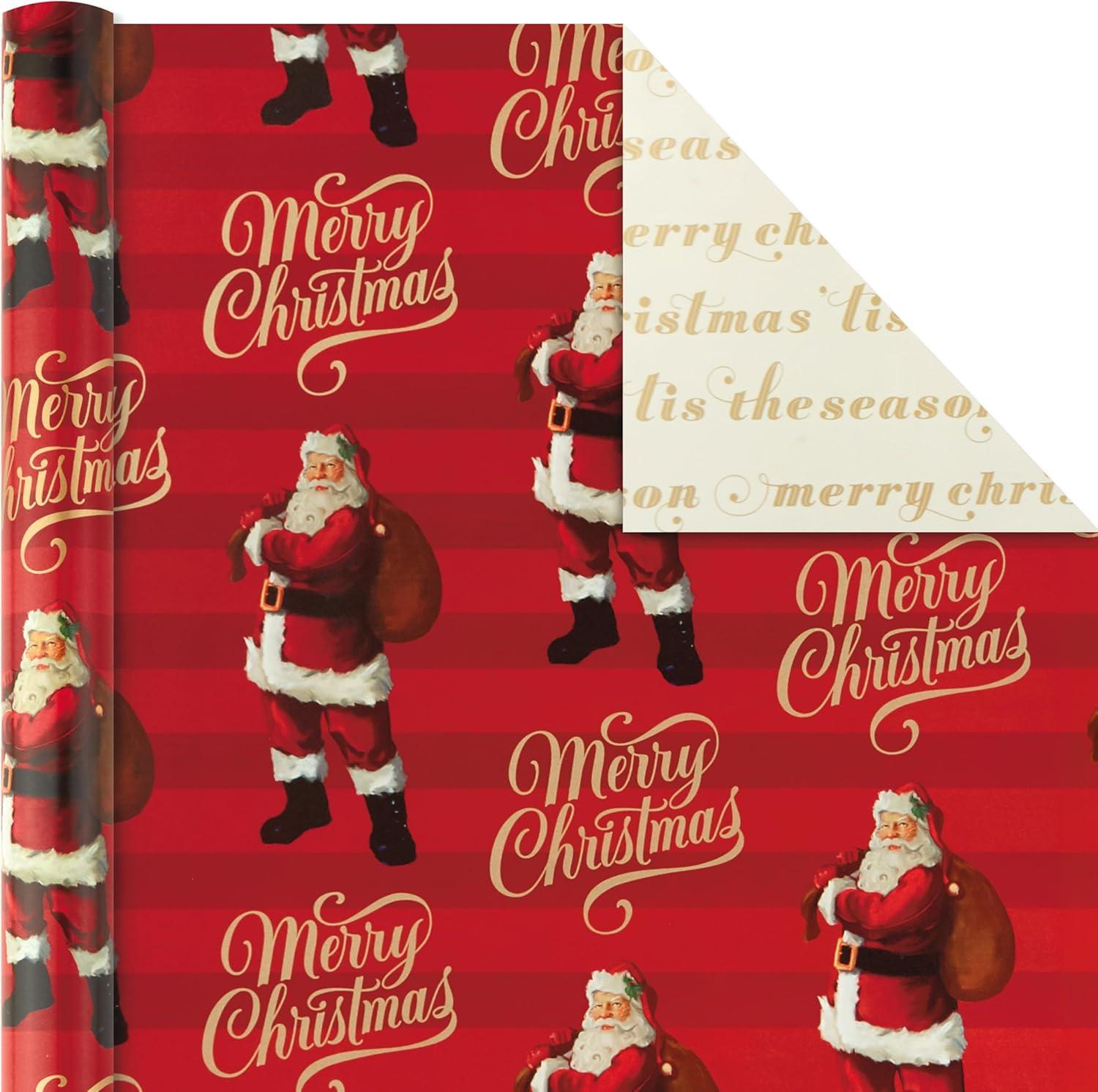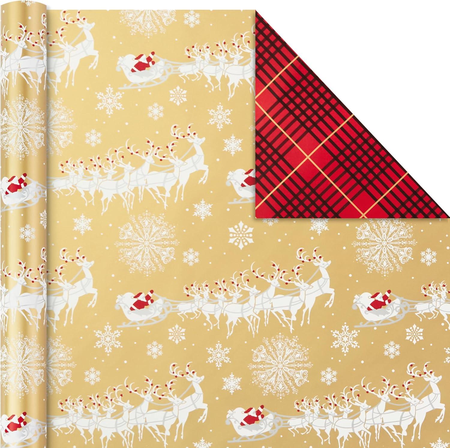 REVERSIBLE DESIGNS: Includes 3 rolls of reversible wrapping paper, each featuring 2 designs: Classic Santa on red / Gold “Happy Holidays” and “'Tis the Season” on white; Sleigh and reindeer on gold / Red and black plaid; Red and gold stripes / Gold snowflakes on red
