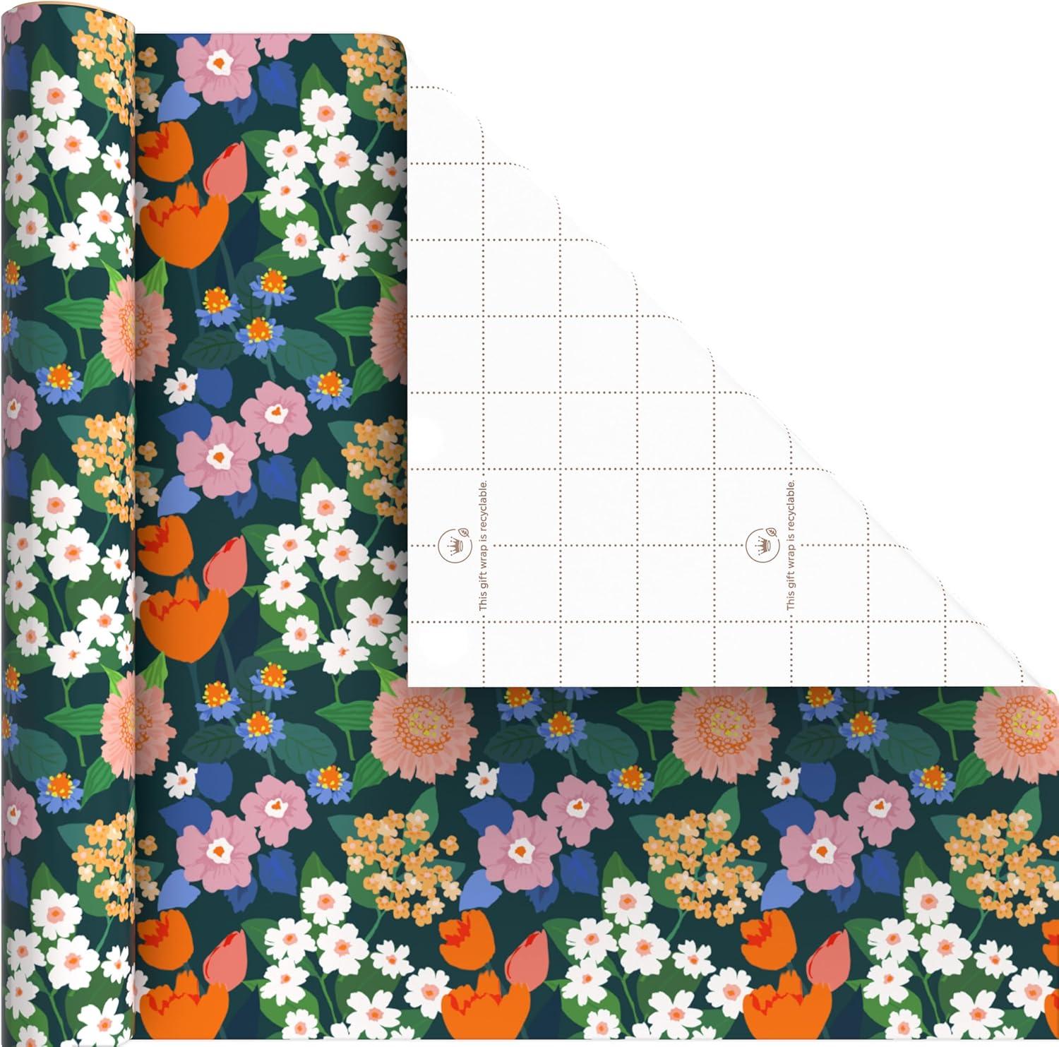 FLORAL DESIGN: Cute wrapping paper features green leaves and flowers in pink, yellow, blue and orange; perfect for celebrating moms, daughters, brides, teachers and more