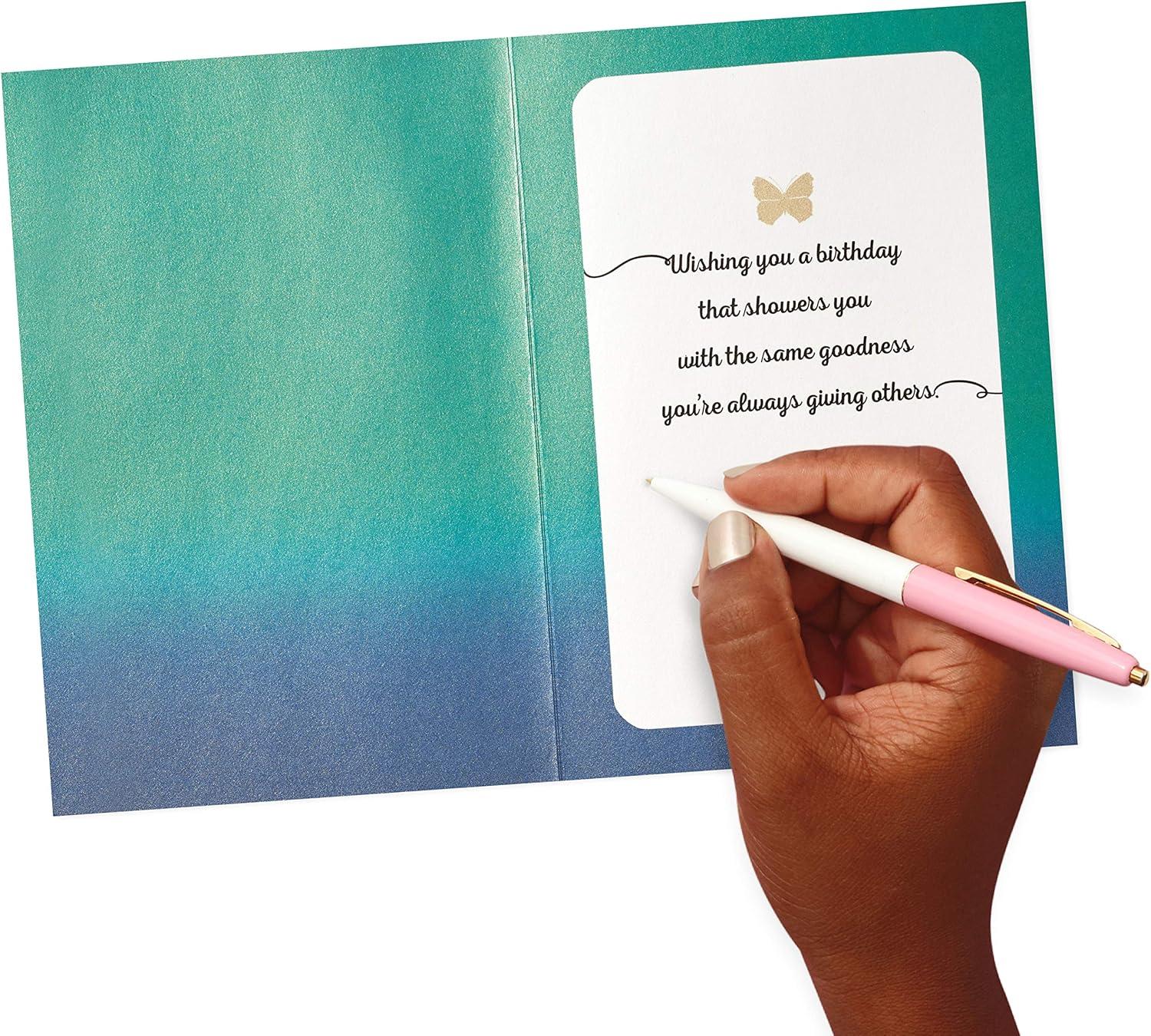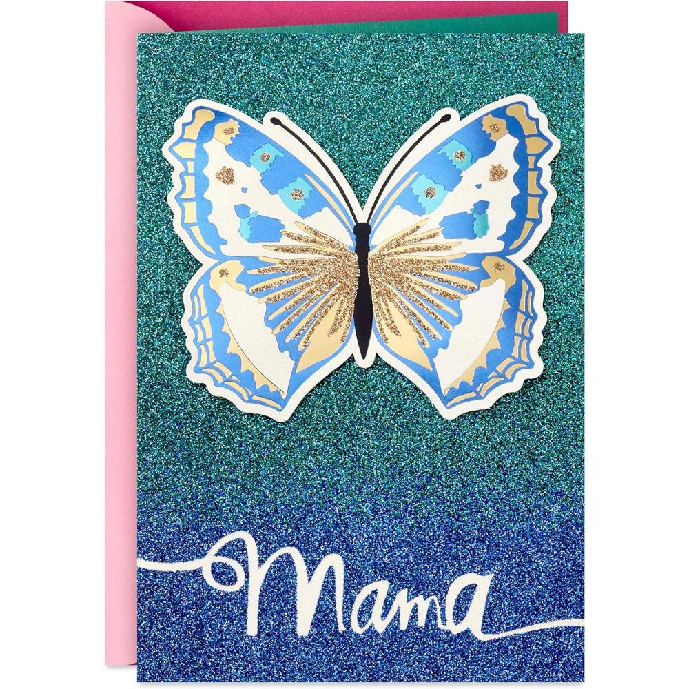 Send your love to Mom on her birthday with this card designed with a resplendent butterfly with white, blue, and gold wings on a green and blue gradient background. Thoughtful message inside is the perfect way to remind her just how great she is. The Hallmark brand is widely recognized as the very best for greeting cards, gift wrap, and more. For more than 100 years, Hallmark has been helping its customers make everyday moments more beautiful and celebrations more joyful.