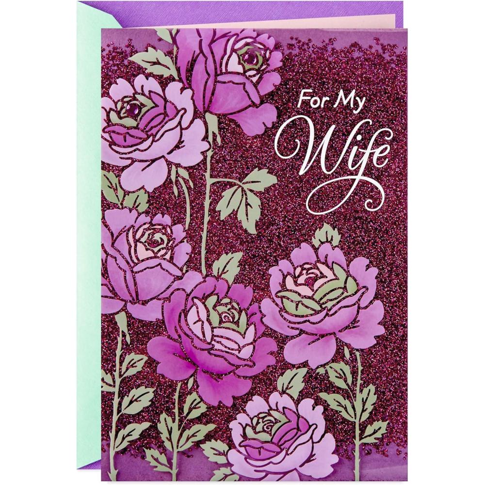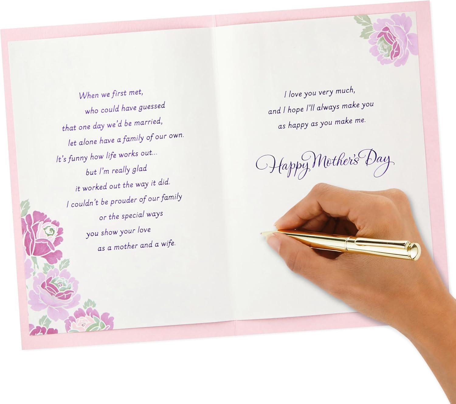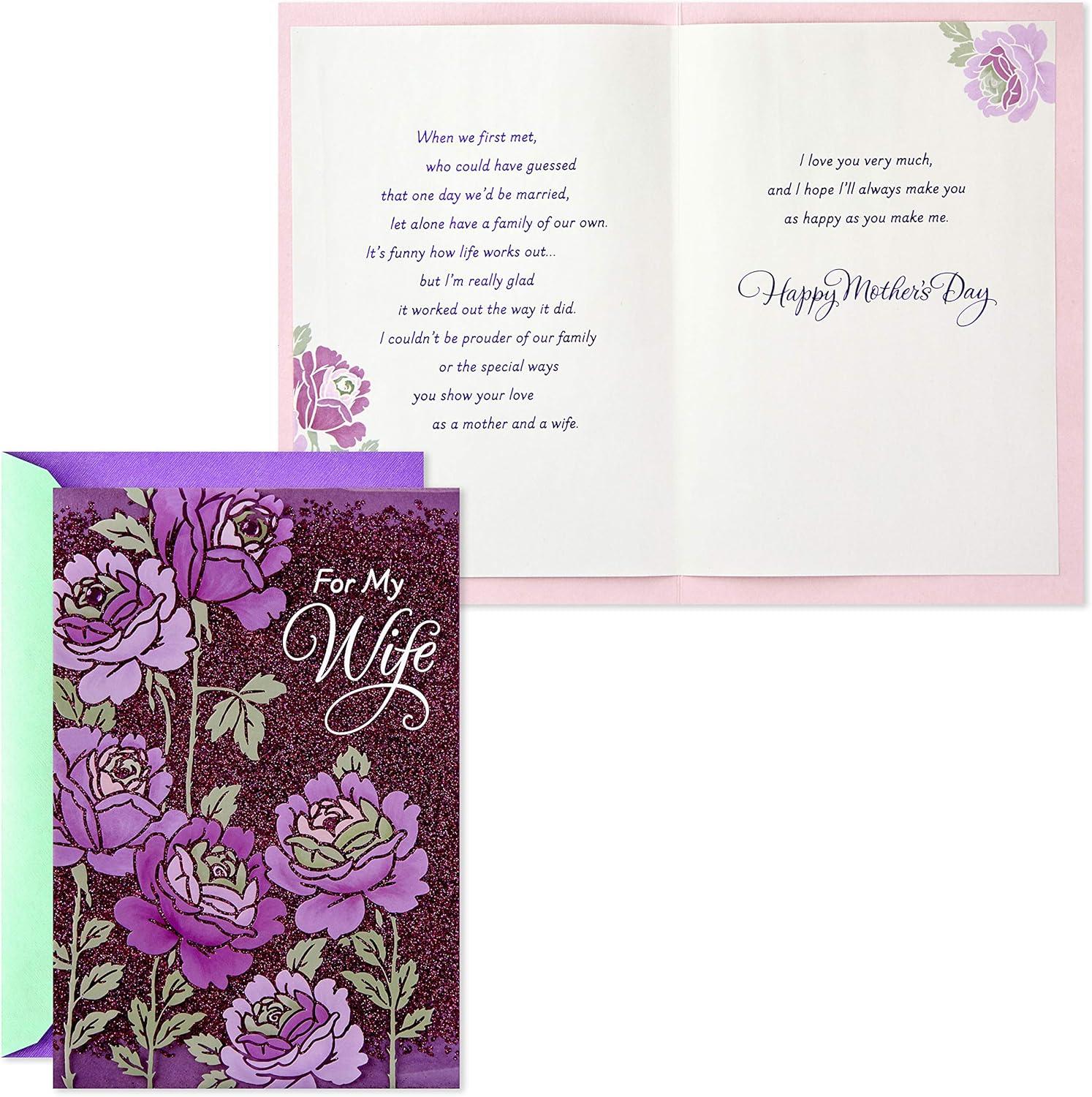 Wish your wife a happy Mother's Day with a beautiful Mother's Day card featuring pretty glitter accents. With a thoughtful sentiment and elegant design, there's plenty of room to write a personalized message inside to one of your favorite people. There's nothing like a note from the heart for a husband or wife to let a special woman know how much she's loved and appreciated on Mother's Day and all year long. The Hallmark brand is widely recognized as the very best for greeting cards, gift wrap, and more. For more than 100 years, Hallmark has been helping its customers make everyday moments more beautiful and celebrations more joyful.
