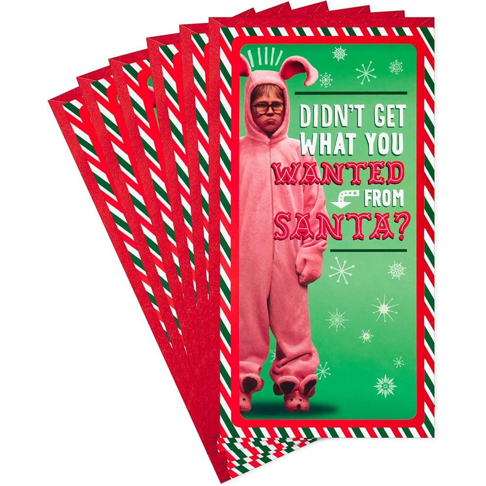 Holiday card pack includes six cards in a single design featuring Ralphie in a pink bunny costume, and lettering that reads: “Didn't get what you wanted from Santa?” accented with a metallic foil striped border.
