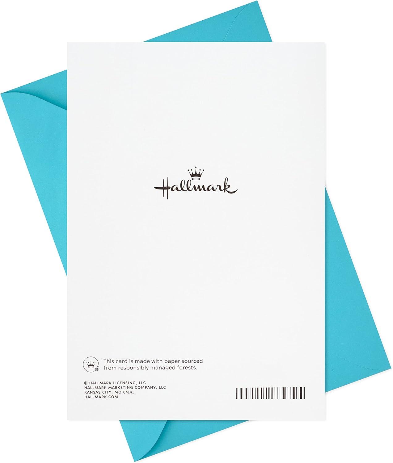 Hallmark card measures approximately 5″ W x 7.25″ H and comes with a coordinating envelope. Envelope color may vary.