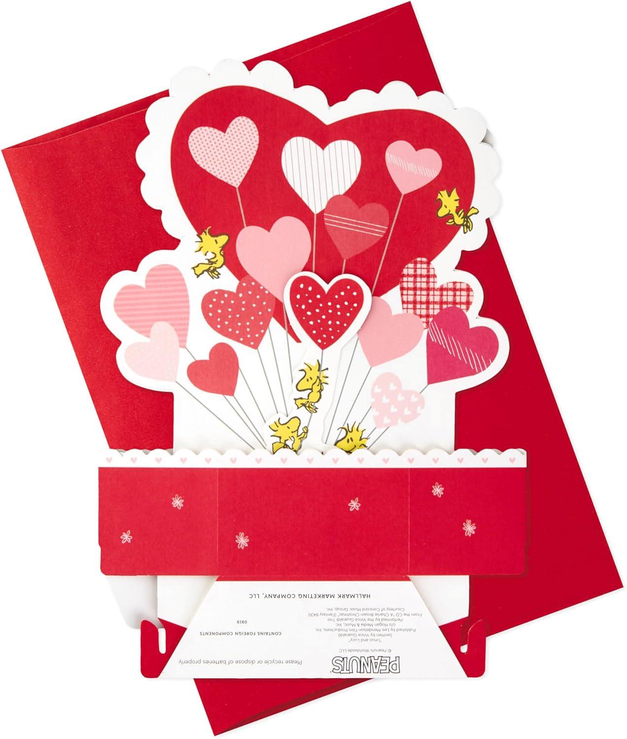 Musical pop-up Valentine's Day greeting card with light features Snoopy, Woodstock and friends with a cart full of heart-shaped balloons paired with a sweet message and a fun surprise: the hearts light up as the “Linus and Lucy” song plays.