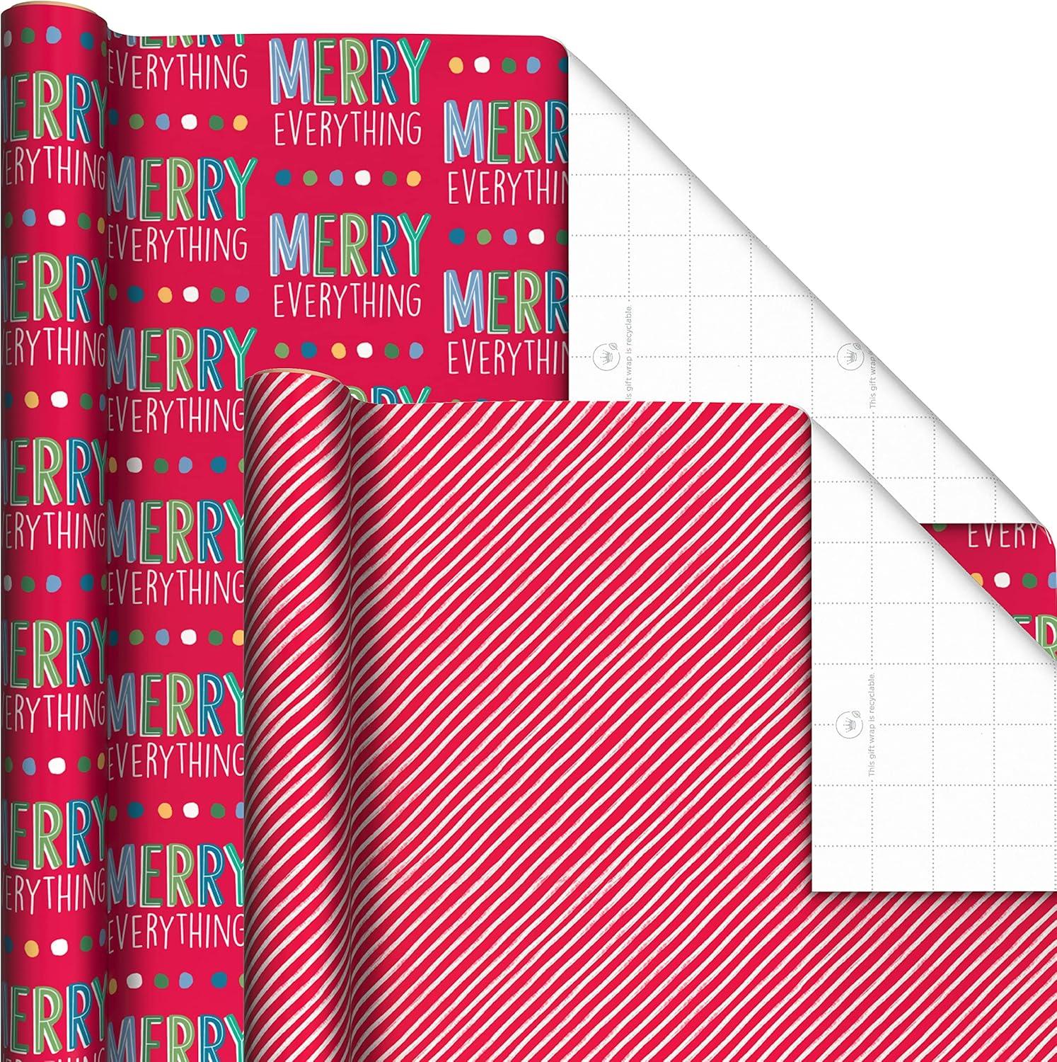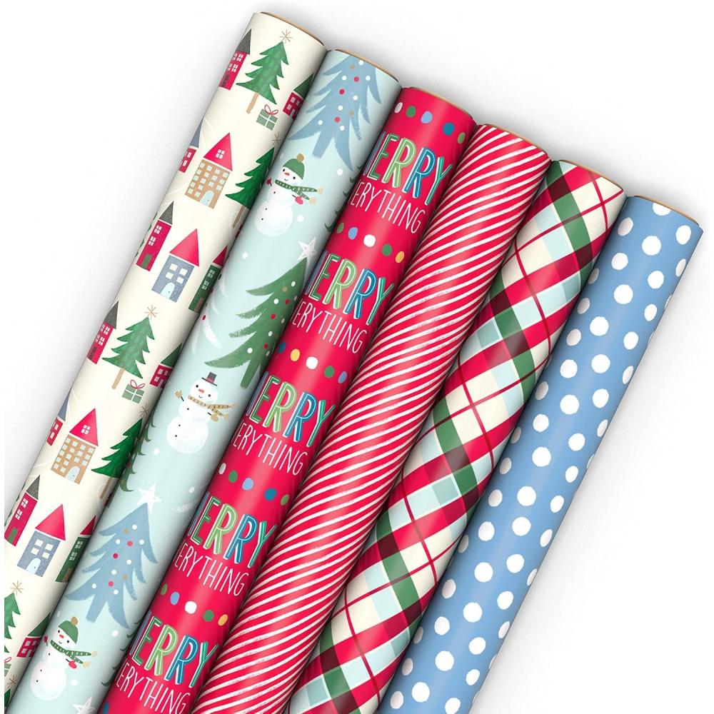 Pack includes 6 reversible Christmas wrapping paper rolls: colorful stripes/snowflakes, polka dots/merry lettering, knit diamonds/winter wear, Santa ice cream truck/blue snowflakes, doodles on red/Christmas treats, candy canes on red/penguins.