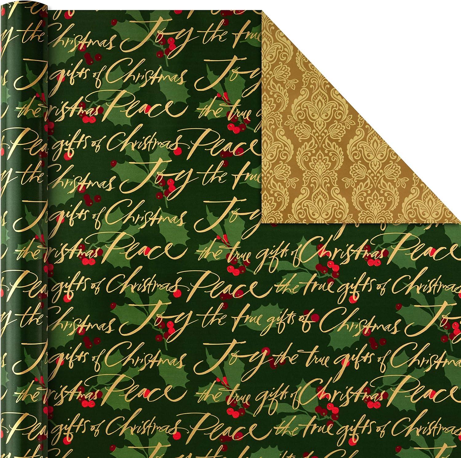 Each roll in this reversible wrapping paper set measures 30 inches wide by 15 feet long for a total of 37.5 square feet per roll, 150 total square feet.